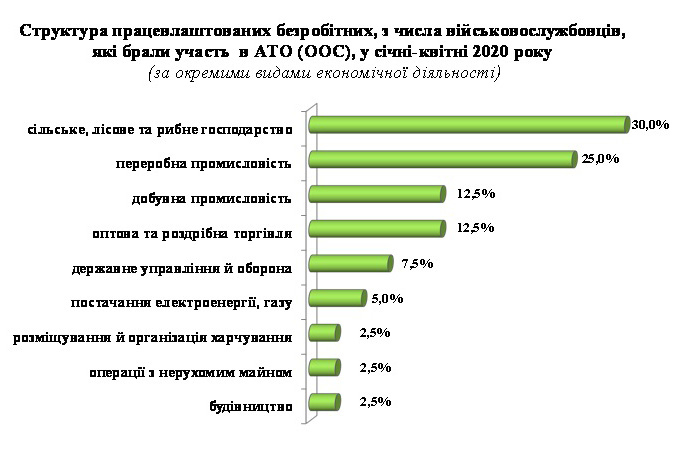 Найбільшим попитом у працевлаштуванні серед демобілізованих військових користувалися сільське, лісове та рибне господарства, переробна і добувна промисловість, оптова та роздрібна торгівля.