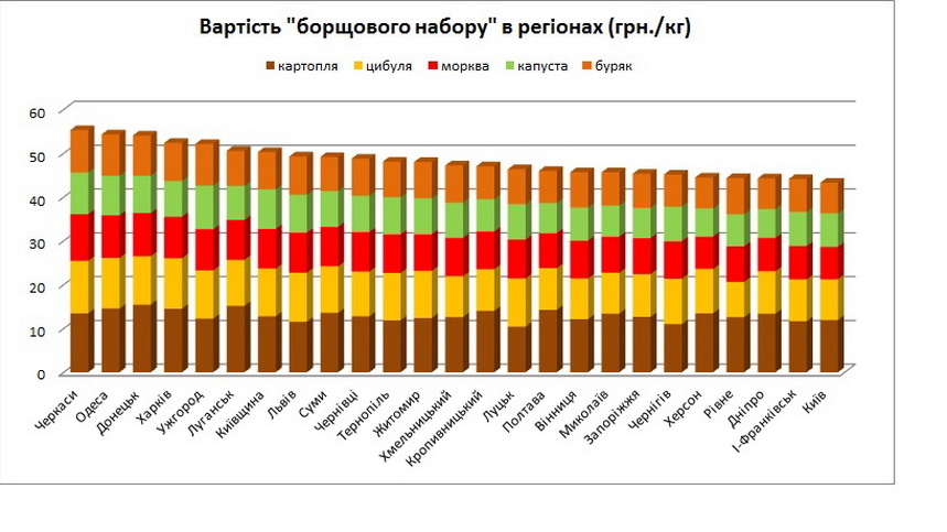 Різниця в цінах на овочі «борщового набору» між регіонами України сягає 20-30%.