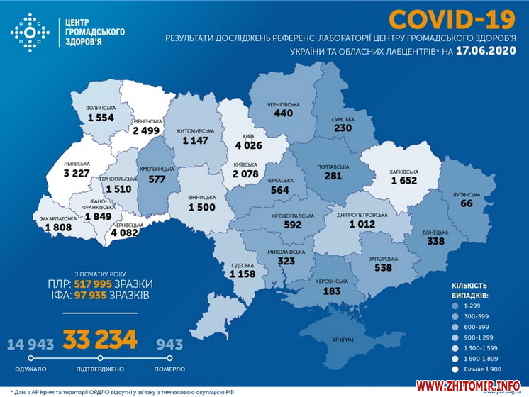 Як повідомляв Житомир.info, станом на ранок 16 червня в Україні підтверджено 32 476 випадків COVID-19. Протягом останньої доби було лабораторно підтверджено 666 випадків. У Житомирській області за добу, 15 червня, підтвердили 14 інфікувань коронавірусом та зареєстрували 12 нових випадків одужання.
