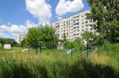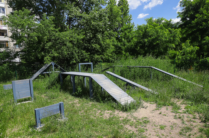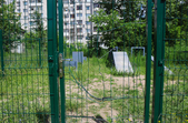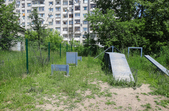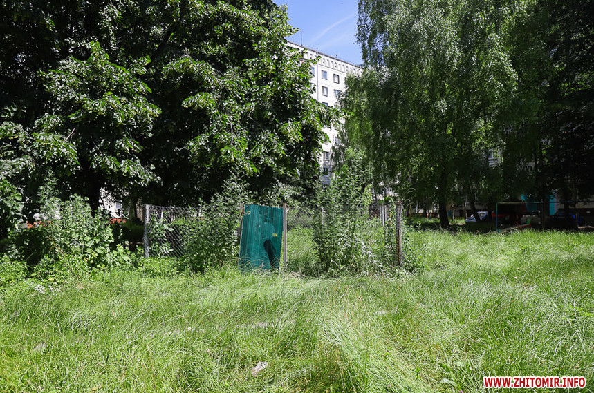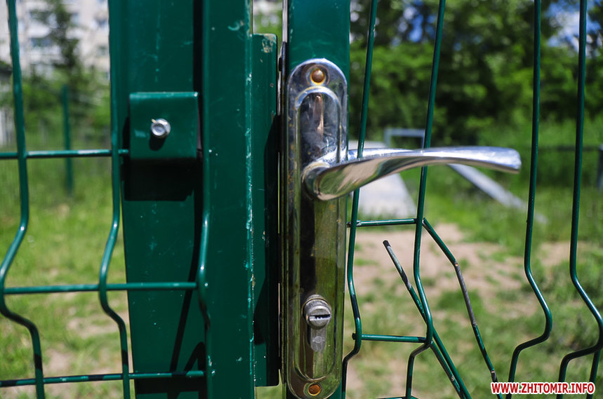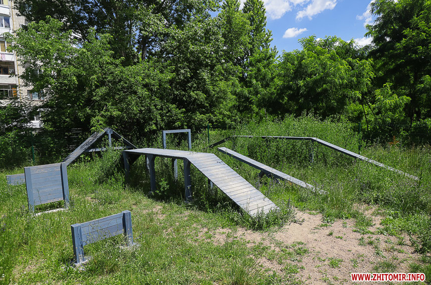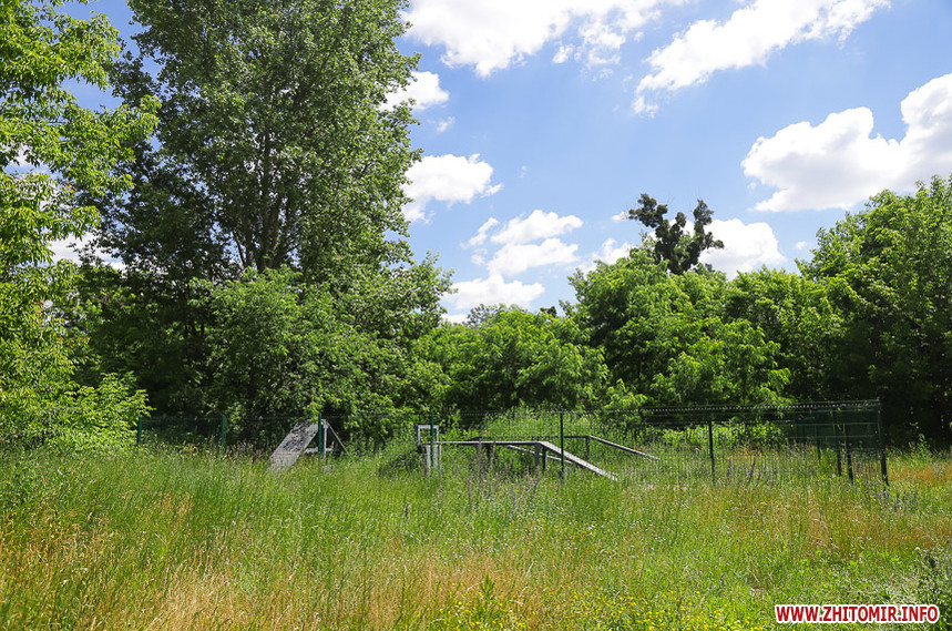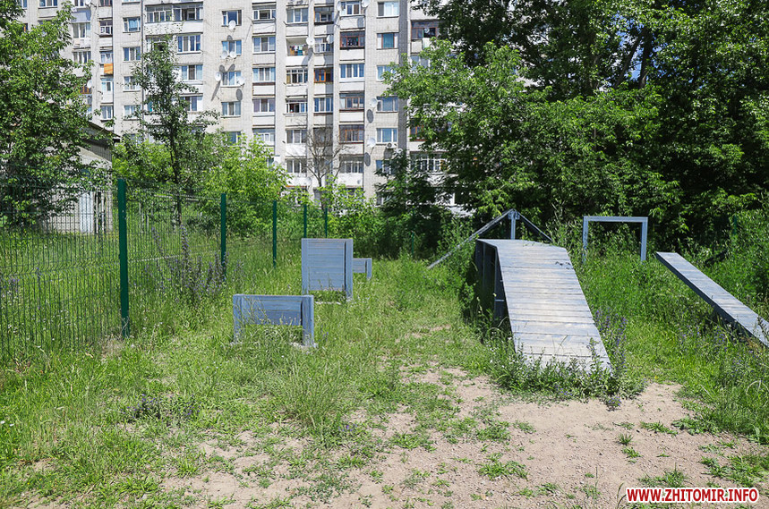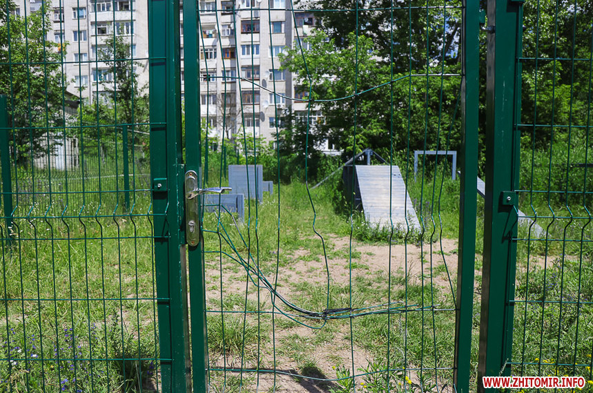 Ще один майданчик для песиків ми знайшли на Героїв Десантників, 23. Зі слів начальника КП «Інспекція з благоустрою м. Житомира» Юрія Юзвинського, він був облаштований приватною фірмою у 2019 році, однак жодному з комунальних підприємств на баланс поки не переданий. Місце огороджене, тут є снаряди для тренування тварин, проте нині майданчик зачинений.