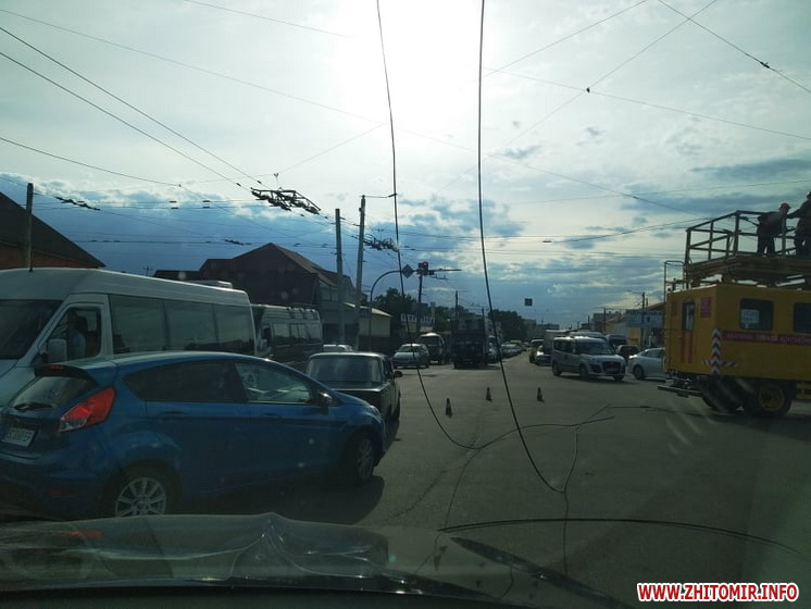 «Дроти валяються по всьому перехрестю, «тягнучка» по Покровській аж до кондитерської фабрики, а по проспекту Незалежності – майже до «Метро», перехрестя важко проїхати», - розповів житомирянин Ярослав, який надіслав фото.