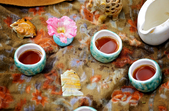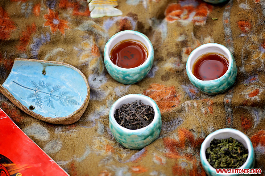 У нас сьогодні тут є пуер, чаочжоу - це різновид улуну, він можна сказати напівтемний, є червоний чай і тігуанінь. Сам процес чайної церемонії починається з того, що ми підігріваємо посуд. Потім ми ополіскуємо, вмиваємо чай, а після цього починаємо його готувати. В середньому класичні чаї витримують шість-сім проливів. Якщо це більш якісний та дорогий чай, то він і дванадцять може витримати. Закінчується тим, що ми можемо перевірити, чи випитий чай повністю. Яким чином? Просто беремо куштуємо чайний лист. Якщо в ньому немає гіркоти, ми випили чай. Якщо ж все ще є, тоді він випитий не до кінця і в ньому залишилися масла.