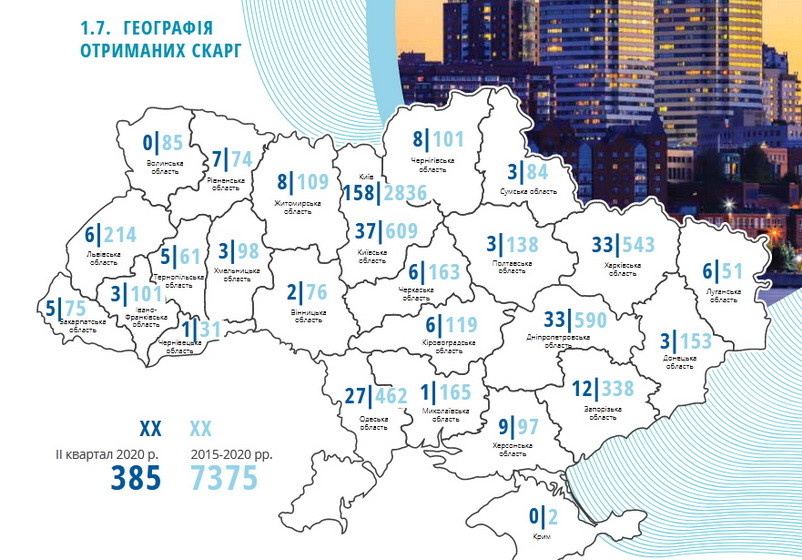 Понад половина (51%) всіх звернень надійшла з Києва та області. Значні частки скарг направили підприємці Дніпропетровської (9%), Харківської (9%) та Одеської (7%) областей.