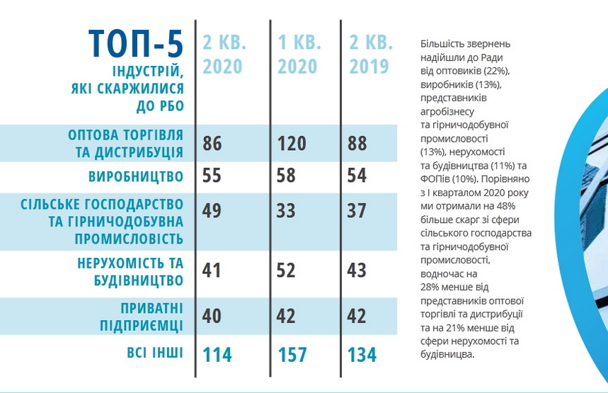 Майже три чверті скарг надійшли від малого та середнього бізнесу. Частка українського бізнесу в структурі звернень склала 86%, бізнесу з іноземним капіталом – 14%. Серед найактивніших галузей, які зверталися до бізнес-омбудсмена – оптова торгівля (22%), промислове виробництво (14%), сільське господарство (13%), представники ринку нерухомості (11%) та приватні підприємці (10%).