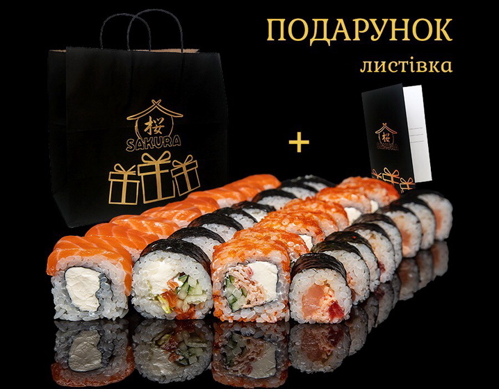 Суші стануть хорошим подарунком для друзів та рідних. Нарешті не потрібно довго думати, що подарувати: святкова подарункова упаковка, листівка з поздоровленням від Сакура Суші, в якій є місце для вашого привітання та смачні роли. Є ще одна приємність – кожного дня діє знижка на один з 5 сетів.