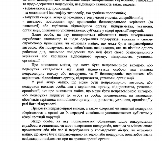 Далі в опублікованому документі вказано, як потрібно поводитися та які дії вчиняти у разі отримання або виявлення подарунків, які можуть бути неправомірною вигодою: відмовитись, залучити свідків, письмово повідомити про пропозицію безпосереднього керівника або правоохоронні органи. Форма повідомлення про отримання такого дарунка також передбачена даним документом.