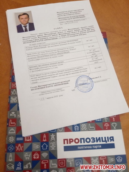 Вранці 23 вересня міська виборча комісія отримала документи партії «Пропозиція», від якої на другий термін збирається балотуватися нинішній мер Житомира Сергій Сухомлин та 42 кандидати в депутати міської ради.