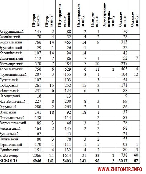 Нагадаємо, станом на 9:00 год. 24 вересня 2020 року в Житомирській області лабораторно підтверджено 5262 випадки коронавірусної хвороби. Протягом останньої доби, 23 вересня, COVID-19 діагностували у 71 жителя області. Також зареєстровано чотири нові летальні випадки, спричинені ускладненнями хвороби. Загалом летальних випадків станом на ранок 24 вересня було 96.