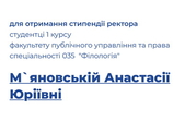 М’яновській Анастасії Юріївні, спеціальність 035 «Філологія» – випускниці Житомирської спеціалізованої школи I-III ступенів №20;