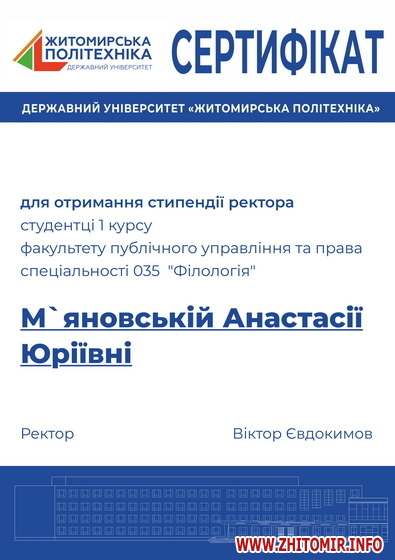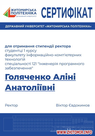 На засіданні Вченої ради університету т.в.о. ректора Житомирської політехніки Оксана Олійник вручила шістьом студентам-першокурсникам університету сертифікати на отримання стипендії: