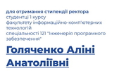Голяченко Аліні Анатоліївні, спеціальність «Інженерія програмного забезпечення» – випускниці Загальноосвітньої школи I-III ступенів №7 імені Валерія Вікторовича Бражевського;