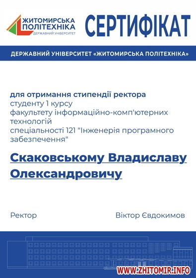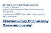 Скаковському Владиславу Олександровичу, спеціальність «Інженерія програмного забезпечення» – випускнику Житомирського міського ліцею №1.