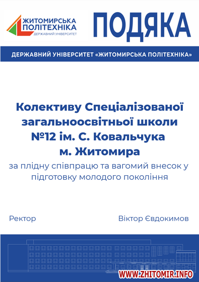 Колективи закладів повної загальної середньої освіти також будуть відзначені подяками Державного університету «Житомирська політехніка» за вагомий внесок у підготовку молодого покоління.