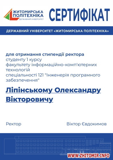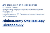 Ліпінському Олександру Вікторовичу, спеціальність «Інженерія програмного забезпечення» – випускнику Житомирського міського ліцею №1;