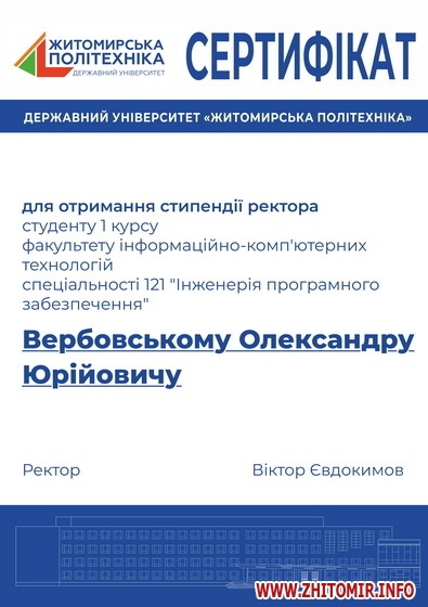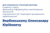 Вербовському Олександру Юрійовичу, спеціальність «Інженерія програмного забезпечення» – випускнику Житомирського міського ліцею №1;