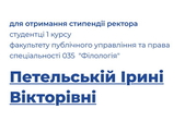 Петельській Ірині Вікторівні, спеціальність 035 «Філологія» – випускниці Загальноосвітньої школи I-III ступенів №12 м. Бердичева Житомирської області;