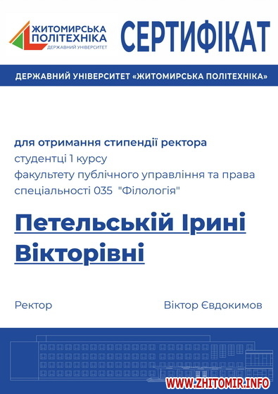 Рішенням Вченої ради університету від 24 вересня 2020 року студентам-першокурсникам освітнього ступеня «бакалавр», з числа осіб, у яких конкурсний бал при зарахуванні 200 балів, призначено стипендію ректора Державного університету «Житомирська політехніка» на 2020/2021 навчальний рік. Стипендія відповідно до Положення «Про стипендію ректора «Державного університету «Житомирська політехніка» виплачується у розмірі звичайної академічної стипендії щомісяця.