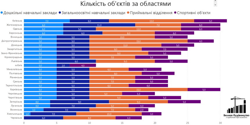Щодо самих об’єктів, то Житомирська область є лідером за кількістю загальноосвітніх навчальних закладів, яких мають збудувати 11.