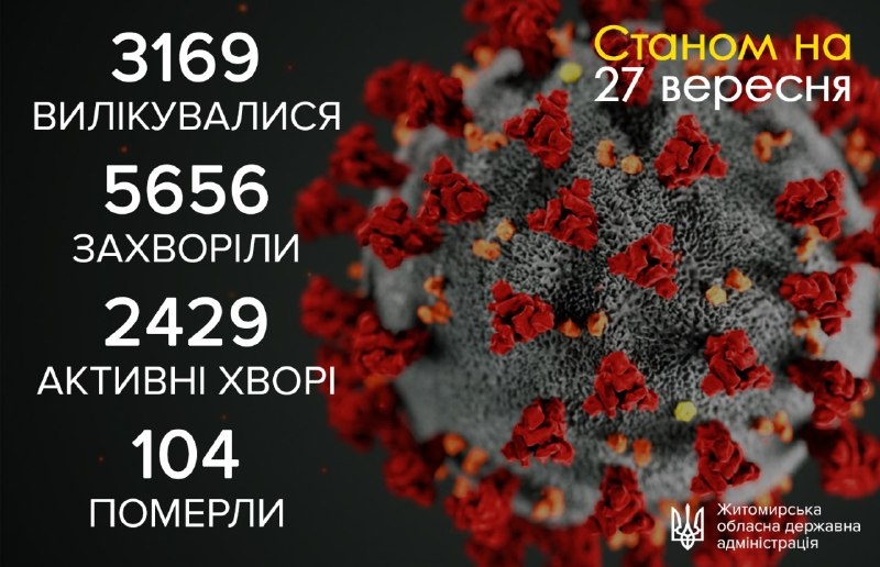 Станом на 09:00 год. 27 вересня у Житомирській області зареєстровано 5656 випадків коронавірусної хвороби. Зокрема за минулу добу, 26 вересня, інфекцію виявили у 125 осіб. Нових летальних випадків не зафіксовано.