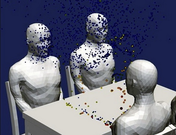 Було змодельовано схему поширення крапель, коли четверо людей сидять навпроти один одного за двома об’єднаними столами, при цьому один з них розмовляє, дивлячись на обличчя іншого близько хвилини.
