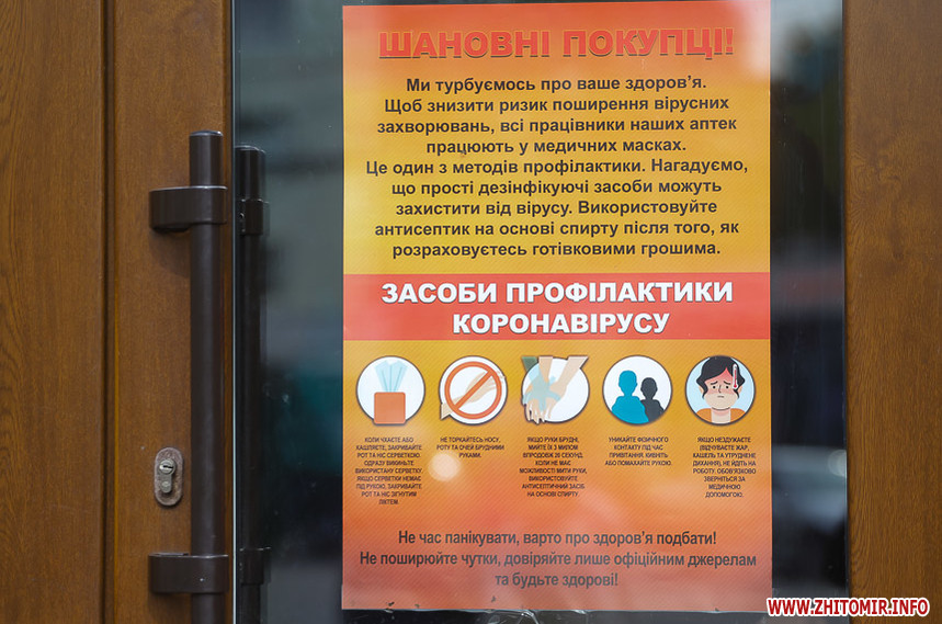 Фото «протикоронавірусних» оголошень, що були розміщені на в житомирських закладах у середині березня 2020 року, дивіться тут