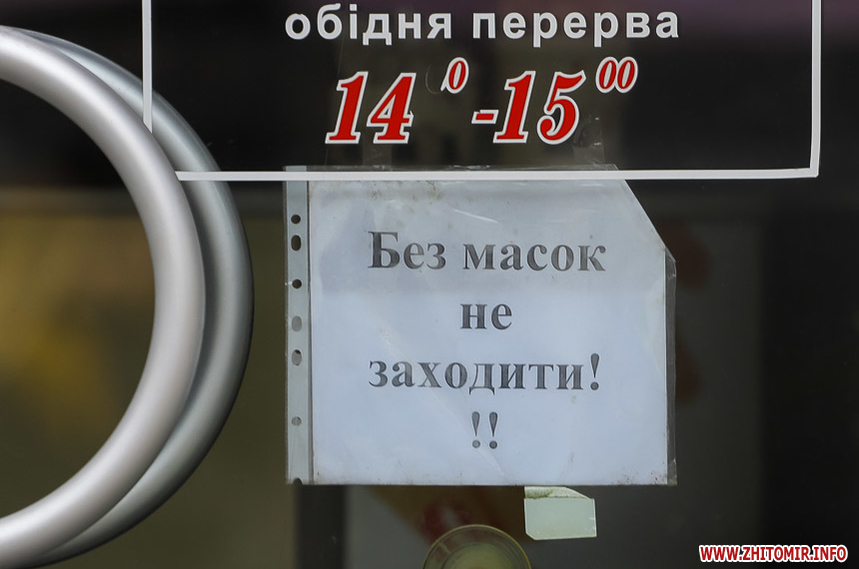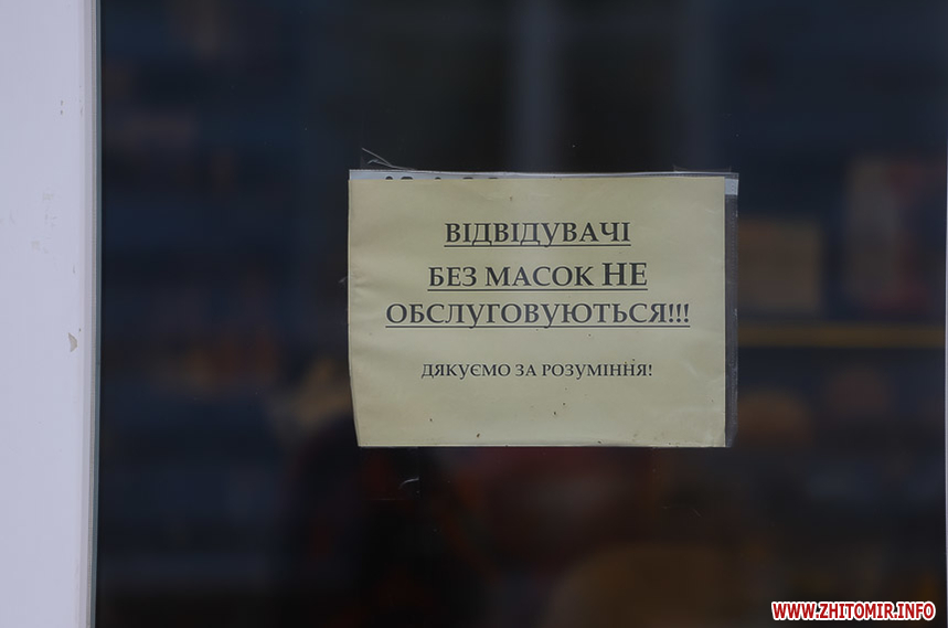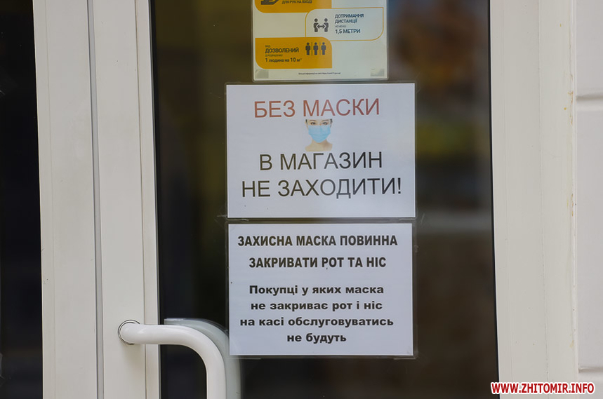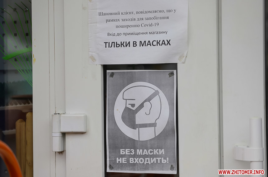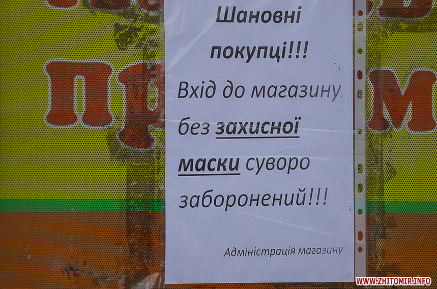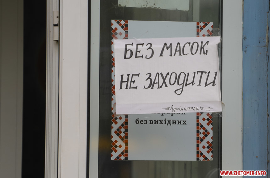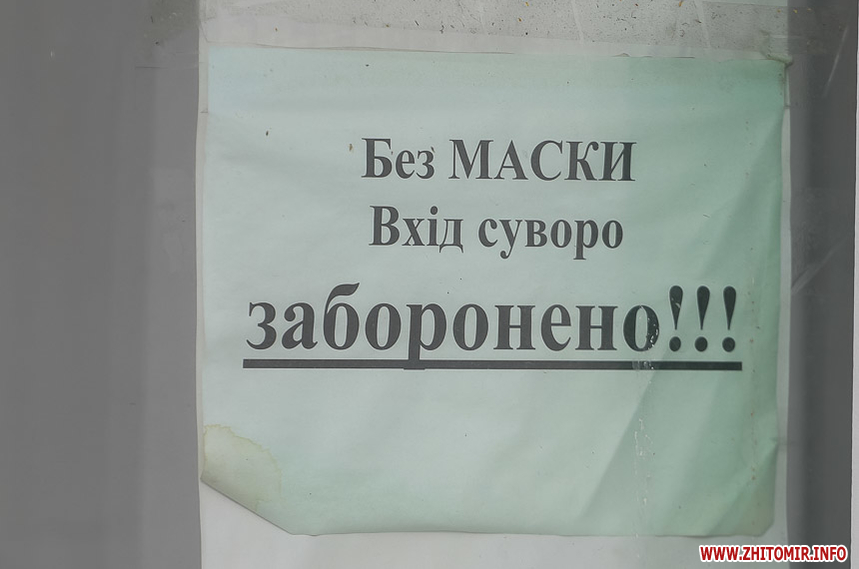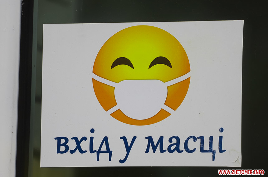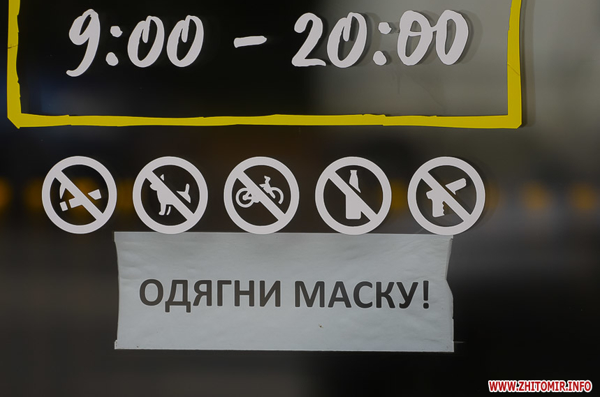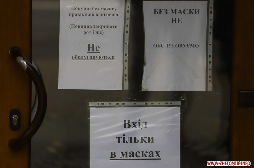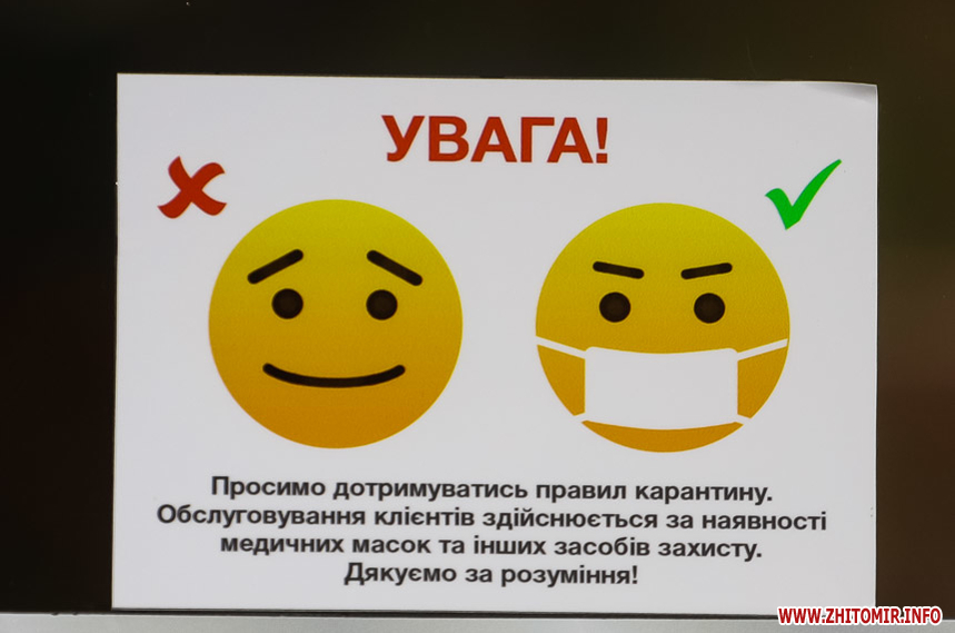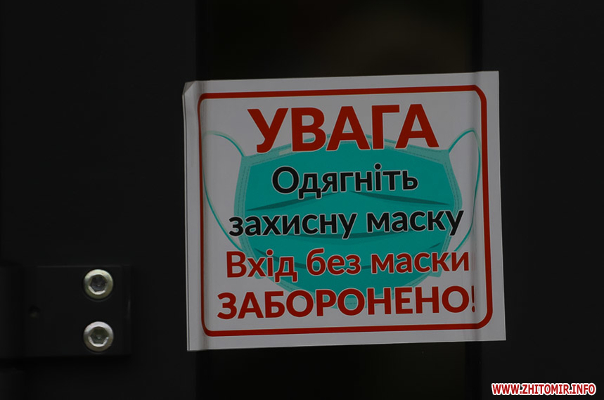Останнім часом епідеміологічна ситуація у Житомирі та області погіршилася, то ж у зв'язку з цим адміністрації багатьох закладів почали більше звертати увагу на те, як їх відвідувачі дотримуються вимог щодо використання масок. За нашими спостереженнями, якщо порівнювати з початком карантину, «протикоронавірусні» написи стали змістовнішими, більш різноманітними та наполегливими. Дехто клеїть на вхідних дверях кольорові наліпки, хтось вивішує роздруковані заклики, інші пишуть застереження від руки. У деяких закладах відвідувачів закликають не панікувати, просять турбуватися про інших, дякують за одягнуту маску, а дехто суворо попереджає, що вхід до магазину без захисної маски заборонений.