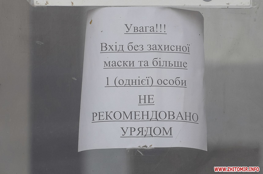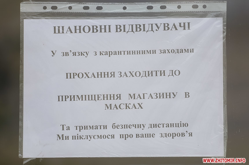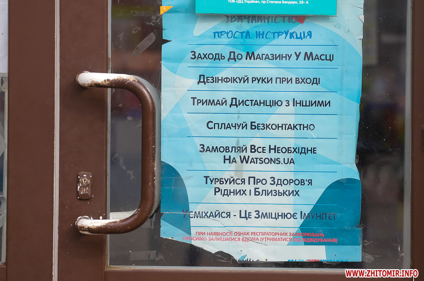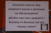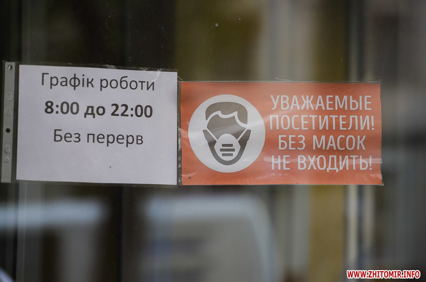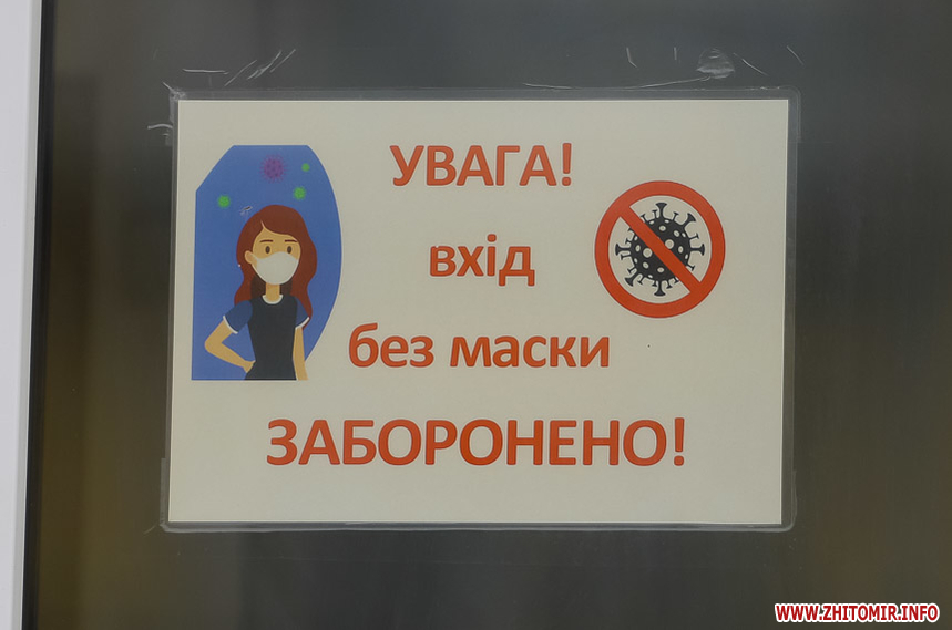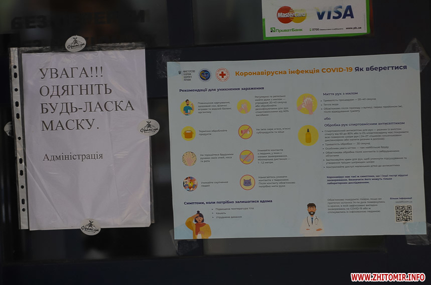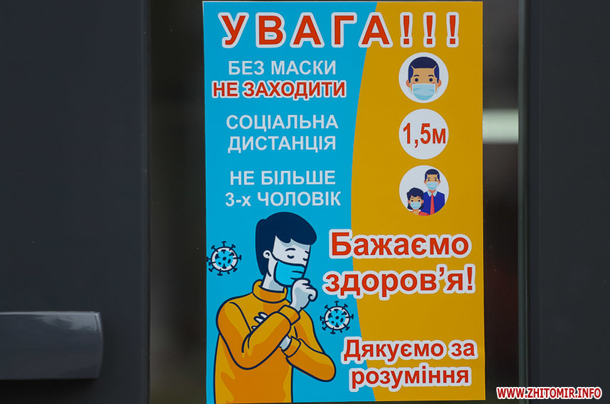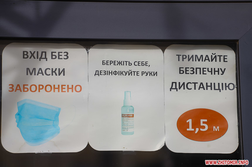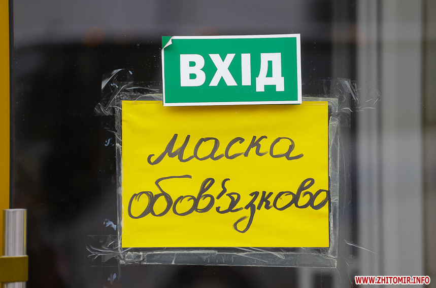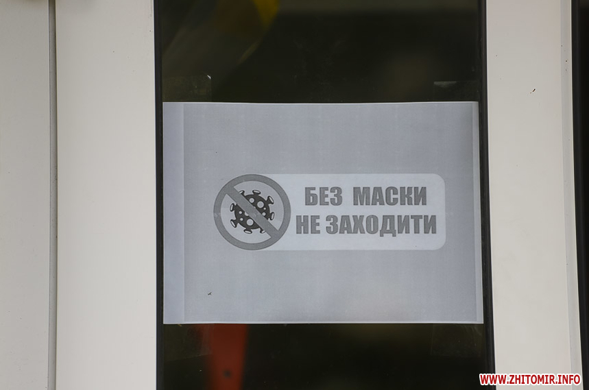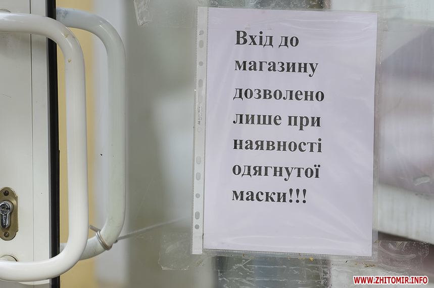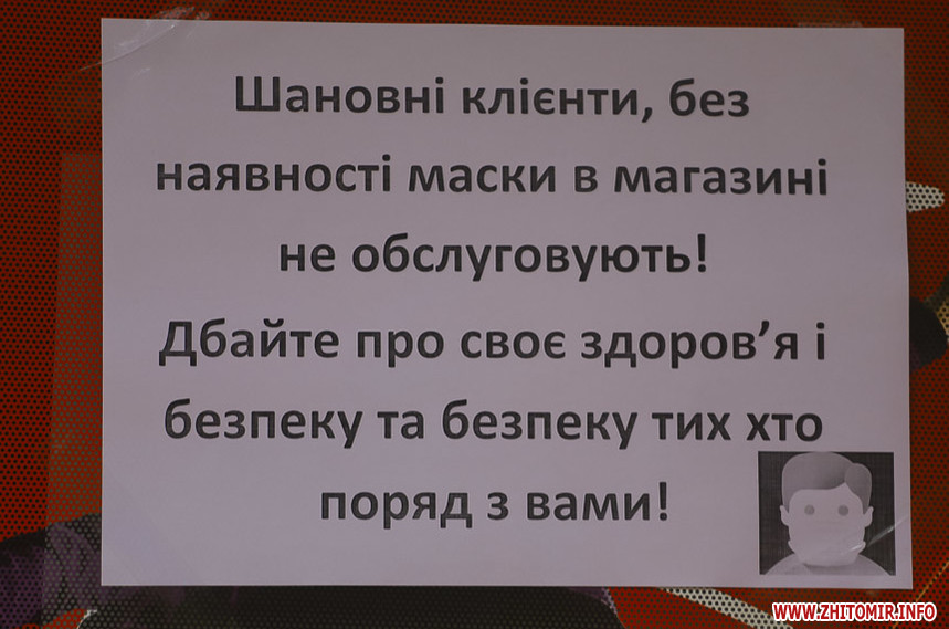 Останнім часом епідеміологічна ситуація у Житомирі та області погіршилася, то ж у зв'язку з цим адміністрації багатьох закладів почали більше звертати увагу на те, як їх відвідувачі дотримуються вимог щодо використання масок. За нашими спостереженнями, якщо порівнювати з початком карантину, «протикоронавірусні» написи стали змістовнішими, більш різноманітними та наполегливими. Дехто клеїть на вхідних дверях кольорові наліпки, хтось вивішує роздруковані заклики, інші пишуть застереження від руки. У деяких закладах відвідувачів закликають не панікувати, просять турбуватися про інших, дякують за одягнуту маску, а дехто суворо попереджає, що вхід до магазину без захисної маски заборонений.