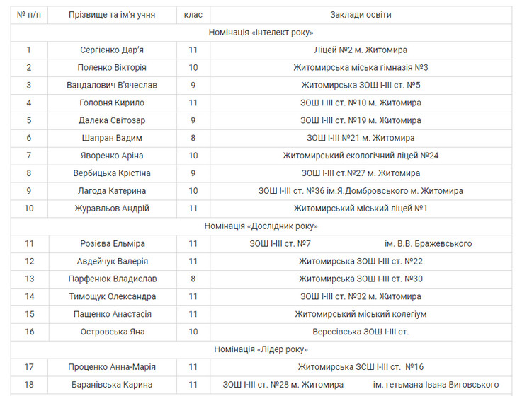 «Три десятки учнів й вихованців житомирських загальноосвітніх та позашкільних навчальних закладів отримали стипендії у розмірі 1000 грн кожний», – йдеться у повідомленні.