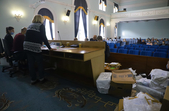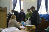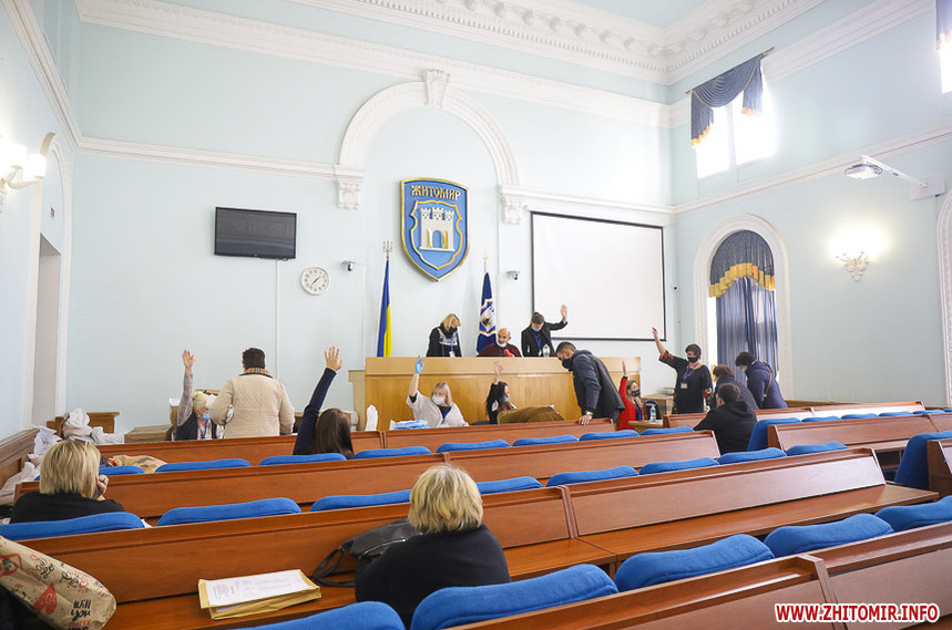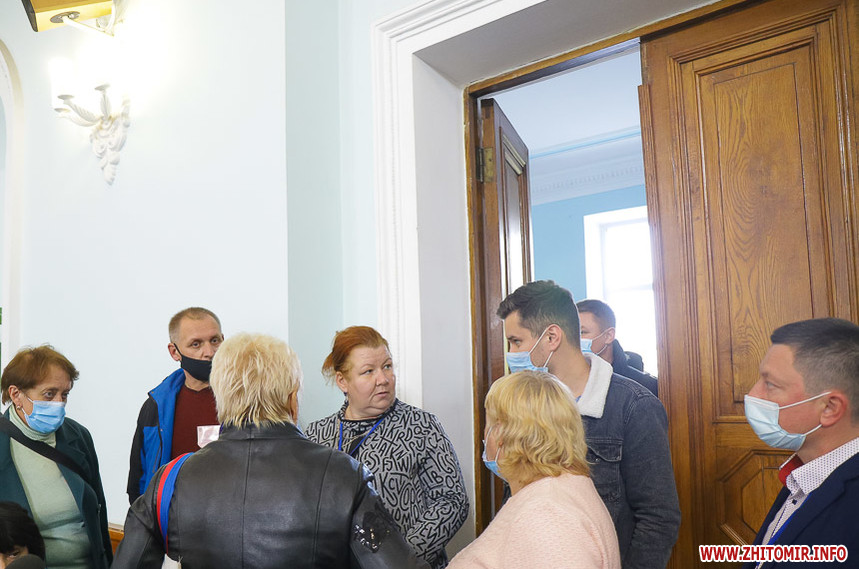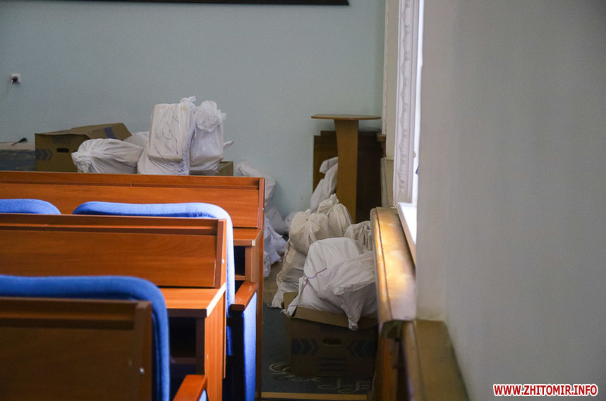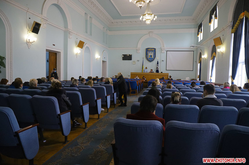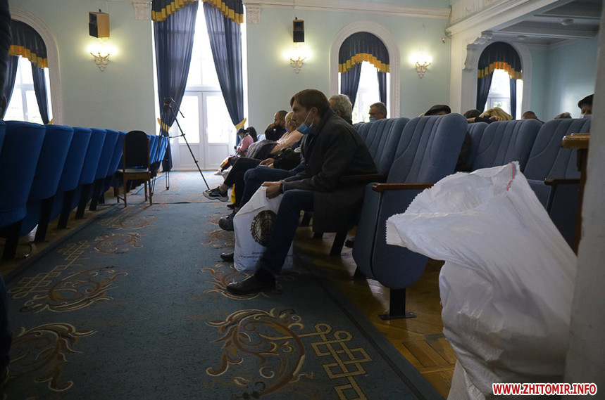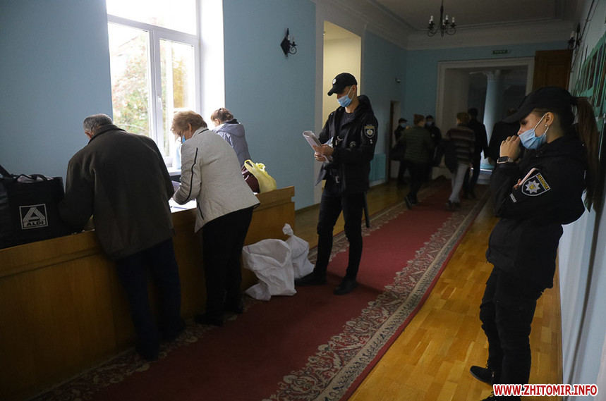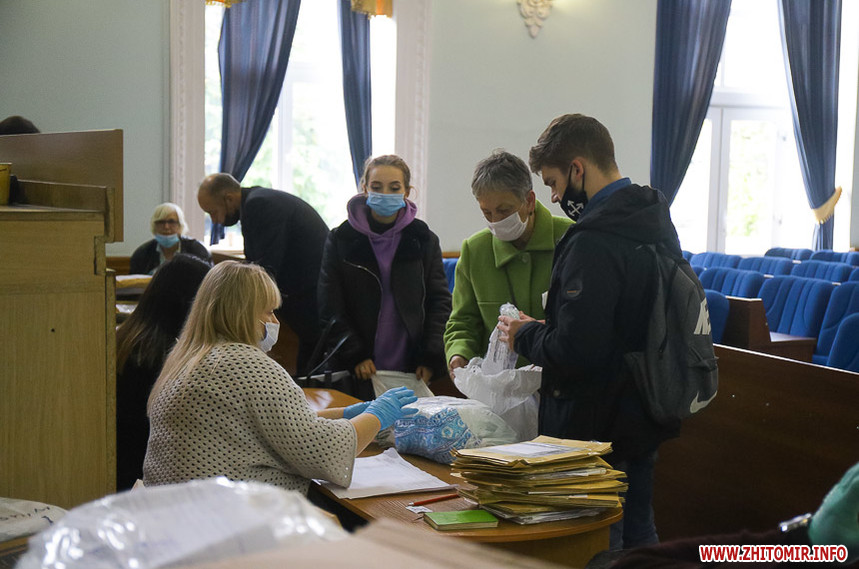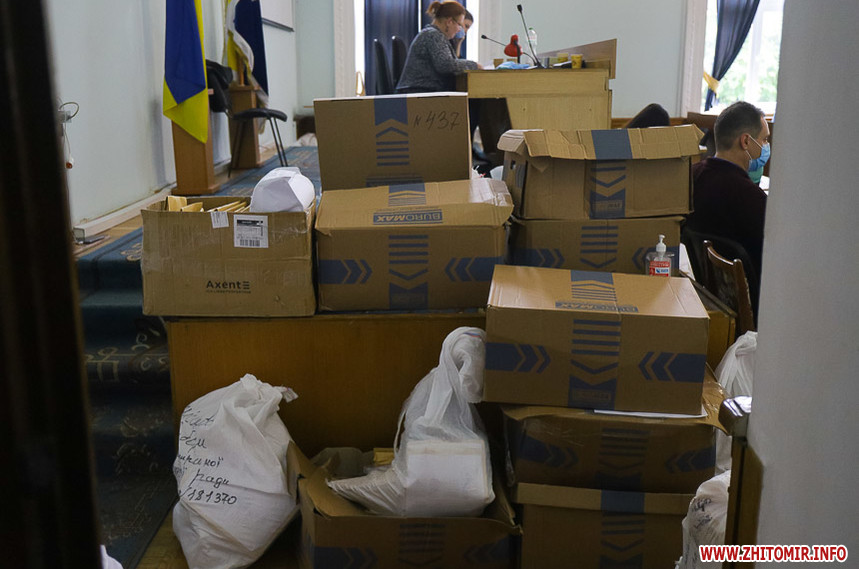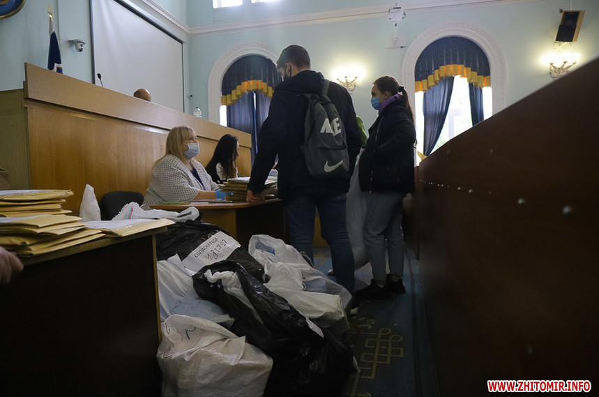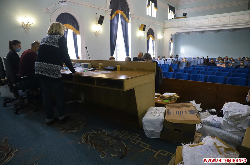 В сесійній залі Житомирської міської ради вдень 26 жовтня міська територіальна виборча комісія приймає протоколи про результати голосування з виборчих дільниць, яких на місцевих виборах 25 жовтня 2020 року було в місті 121.