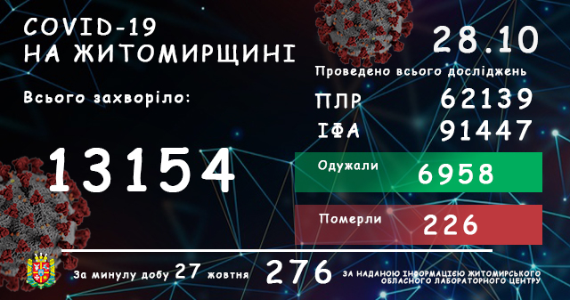 Станом на ранок 28 жовтня в Житомирській області лабораторно підтверджено 13154 випадки коронавірусної хвороби, одужали 6958 людей, 226 – померли. За останню добу виявили 276 нових інфікованих COVID-19.