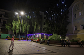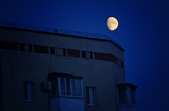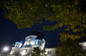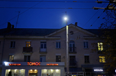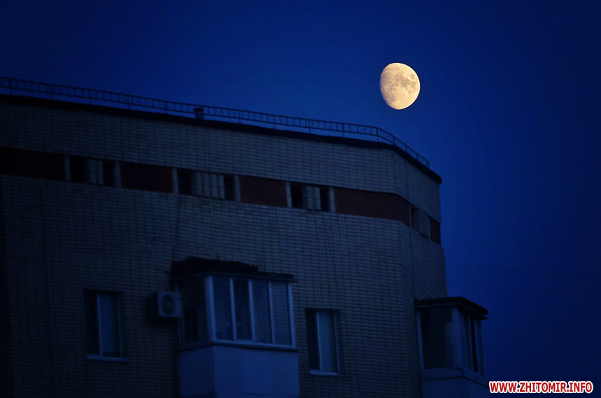 Насичено синє полотно неба, серед якого – майже повний жовтуватий місяць, що нагадує свіжоспечений млинець, позолочені й багряні осінні дерева, увімкнені ліхтарі та підсвічені фасади будівель – це про вечірній Житомир.