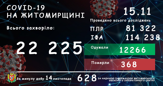 Станом на 09:00 год. 15 листопада у Житомирській області лабораторно підтверджено 22 225 випадків коронавірусної хвороби. Зокрема, за минулу добу, 14 листопада, COVID-19 підтвердили в 628 осіб. За період пандемії зафіксували 368 летальних випадків, в тому числі 8 – протягом минулої доби. Хворобу подолали 12266 пацієнтів, за добу зареєстрували 188 випадків одужання.