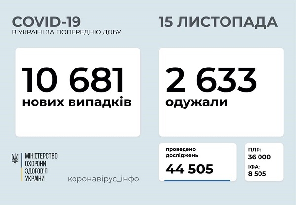 За даними Міністра охорони здоров’я Максима Степанова, за добу 14 листопада в Україні зафіксовано 10 681 новий випадок коронавірусної хвороби COVID-19. Зокрема, захворіли 420 дітей та 391 медпрацівник.