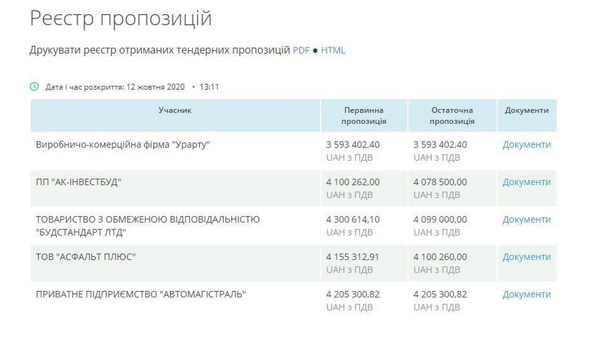 - ТОВ “Асфальт Плюс” з пропозицією у 4 млн 100 тис. 260 грн;