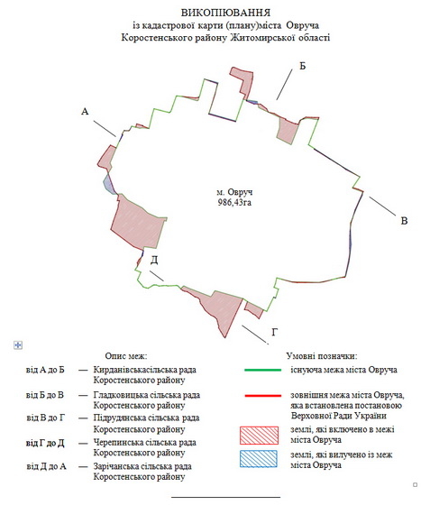 «Змінити межі міста Овруча Коростенського району Житомирської області, збільшивши територію міста на 105,68 гектара земель, у тому числі за рахунок 37,23 гектара земель Підрудянської сільської ради, 12,49 гектара земель Гладковицької сільської ради, 7,64 гектара земель Кирданівської сільської ради, 48,32 гектара земель Черепинської сільської ради Коростенського району, водночас передавши 6,42 гектара земель Овруцької міської ради, а саме 1,24 гектара земель Підрудянської сільської ради, 1,31 гектара земель Гладковицької сільської ради, 0,9 гектара земель Кирданівської сільської ради, 2,97 гектара земель Черепинської сільської ради Коростенського району, та затвердити територію міста Овруча загальною площею 986,43 гектара. Встановити межі міста Овруча Коростенського району Житомирської області відповідно до проекту землеустрою щодо встановлення (зміни) меж адміністративно-територіальної одиниці — міста Овруча за рахунок земель Підрудянської, Гладковицької, Черепинської та Кирданівської сільських рад Коростенського району Житомирської області», - йдеться в ухваленій постанові.