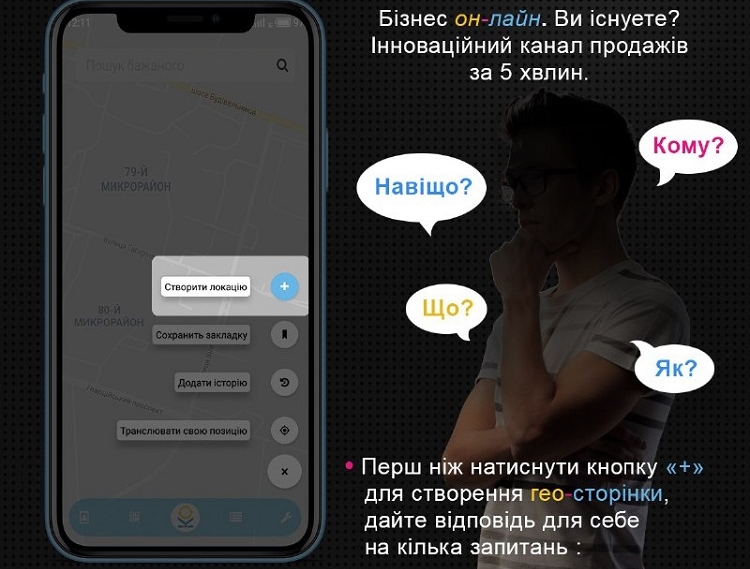 Якщо ж у вас виникають складнощі у створенні геолокації, зв’яжіться з нами (форма для звернення та контакти є на сайті kolo.ooo Звернутися за допомогою можна також у додатку – на геосторінку Kolo Дизайн) – і наші фахівці допоможуть оформити пропозицію, яка буде продаватися. До Нового року така послуга надається безкоштовно (далі – за дуже помірну плату).