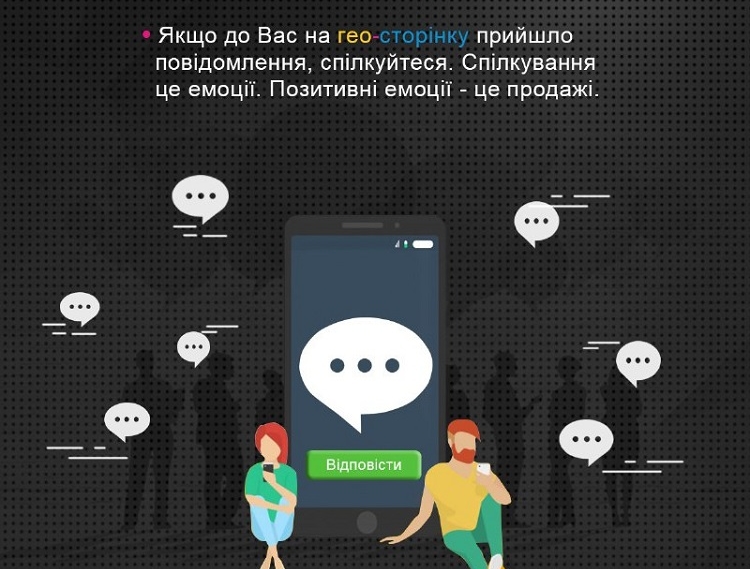 Якщо на вашу сторінку прийшло повідомлення – спілкуйтеся. Спілкування – це емоції, позитивні емоції – це продажі. Формуйте найближче оточення своїх клієнтів, які можуть вас порекомендувати друзям, пропонуйте їм бонуси і знижки.