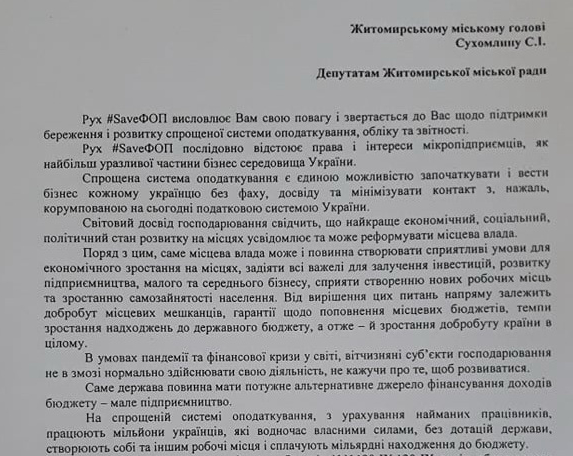 Першим питанням депутати одноголосно проголосували за звернення до Кабміну, президента та Верховної ради на підтримку малого бізнесу. Звернення до депутатів з проханням про підтримку представники руху SaveФОП передали на початку сесії.