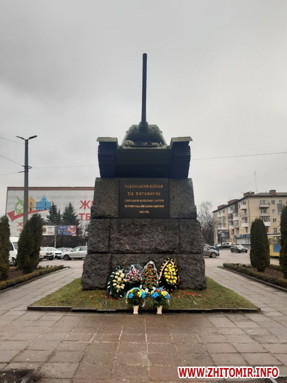 Натомість пресслужба облдержадміністрації інформує, що заступник голови Житомирської ОДА Віктор Градівський спільно з директором департаменту культури, молоді та спорту ОДА Максимом Обштою та представниками управління культури Житомирської міської ради поклали квіти до танку на майдані Перемоги, який встановлено у 20-у річницю перемоги над нацистськими військами та на честь деокупації міста Житомир.