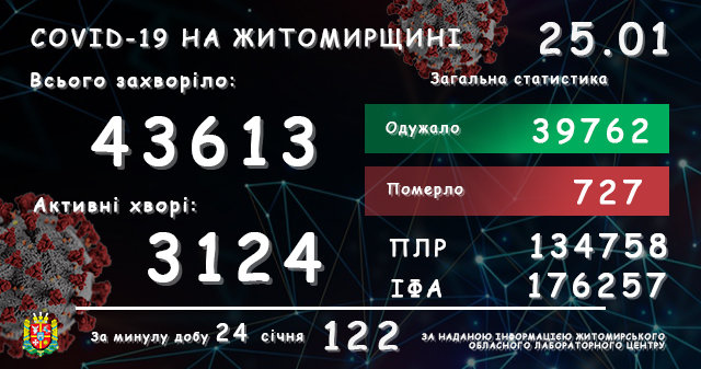 Станом на 09:00 год. 25 січня 2021 року в Житомирській області лабораторно підтвердили 43613 випадків коронавірусної хвороби. Зокрема, за минулу добу, 24 січня, зареєстрували 122 нові випадки. За період пандемії від ускладнень COVID-19 померли 727 пацієнтів, у тому числі минулої доби зафіксували три летальні випадки. Одужало загалом 39762 особи.