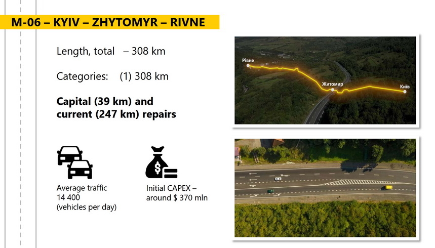 Як повідомляв Житомир.info, 29 жовтня 2020 року в Україні презентували першу програму державно-приватного партнерства у дорожній галузі: 6 ділянок доріг загальною протяжністю 1500 км, які були відібрані для потенційних пілотних проєктів ДПП, будуть реалізовані в рамках цієї Програми на першому етапі, в тому числі – капітальний і поточний ремонти дороги Київ-Житомир-Рівне (М-06), орієнтовний обсяг початкових інвестицій – 370 млн доларів.