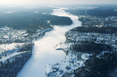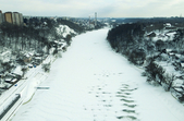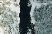 Вздовж річки можна побачити, як вітер утворив лінії зі снігу, які можна порівняти з картиною із зимовими пейзажами.