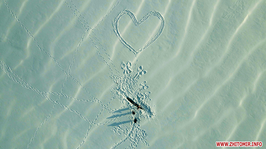 З висоти помічаємо і малюнки, які залишили на снігу житомиряни: сердечка, ангели та імена.