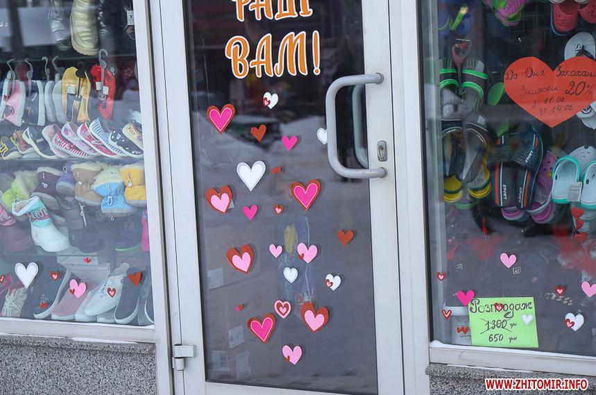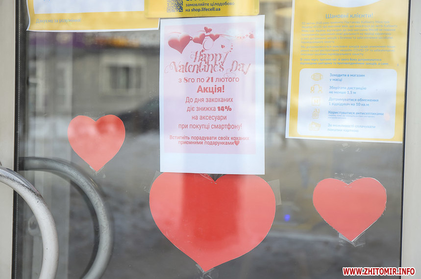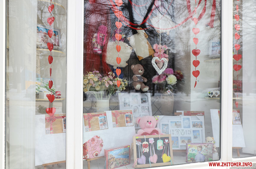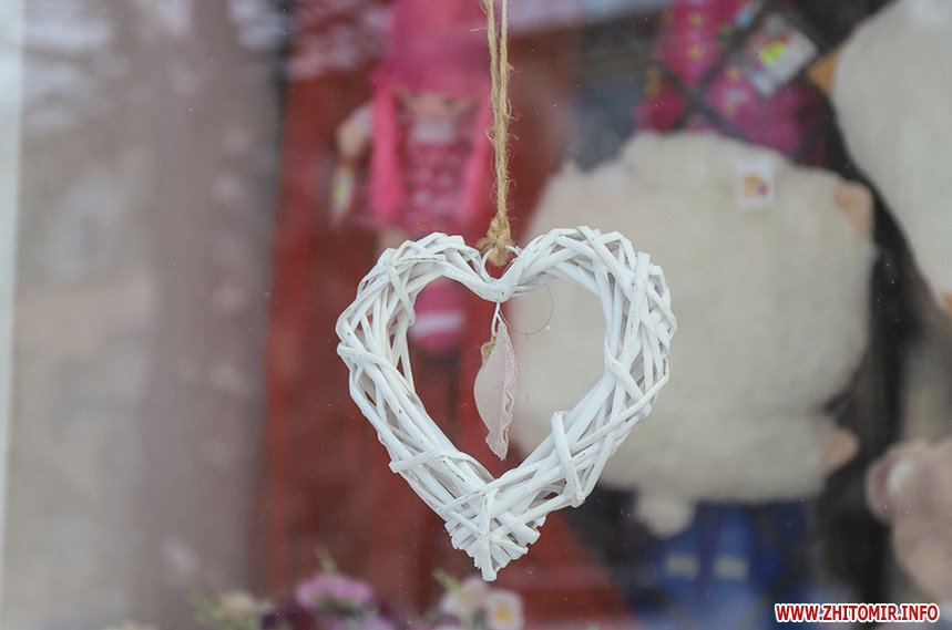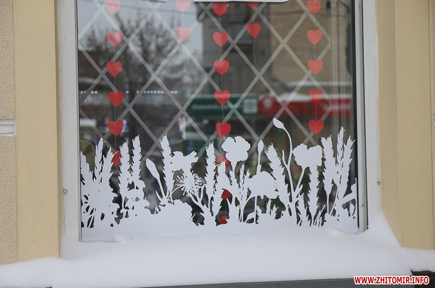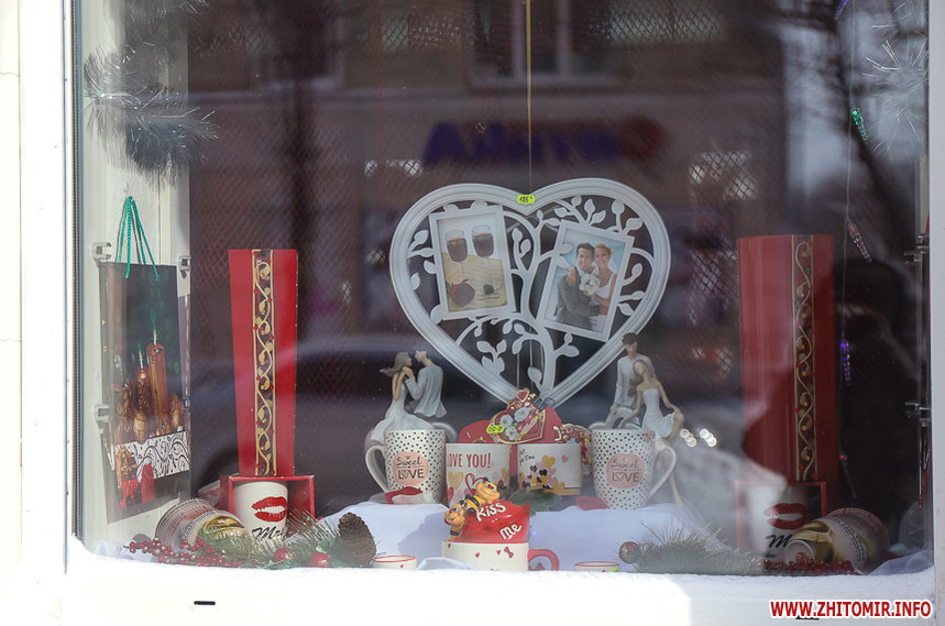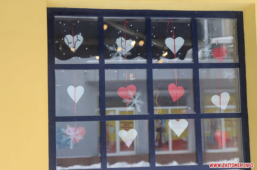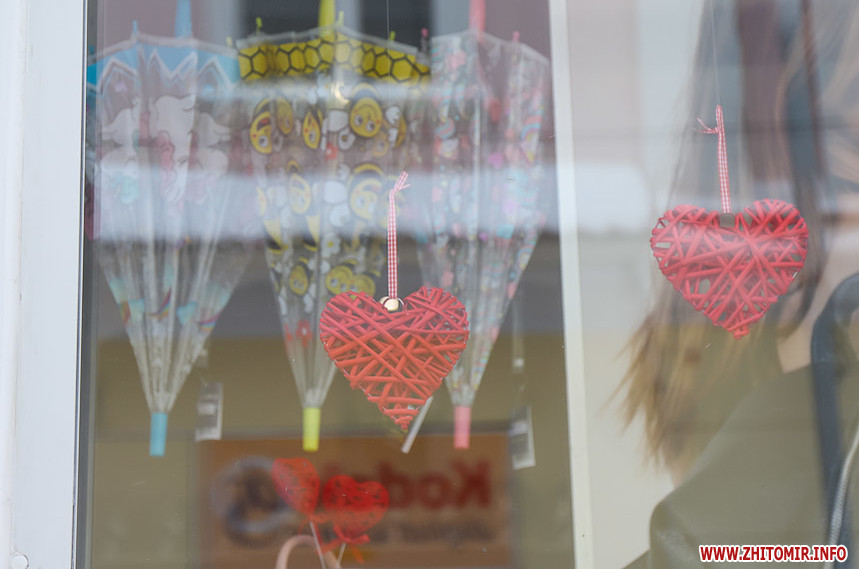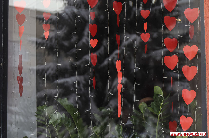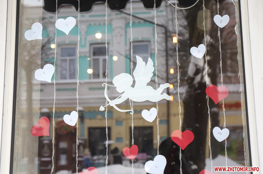 Вже традиційно перед Днем закоханих житомирські заклади та магазини прикрашають свої вітрини у святковій тематиці. У вікнах кафе та магазинів центральних вулицях міста можна побачити безліч сердечок різних форм, розмірів і текстур.