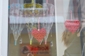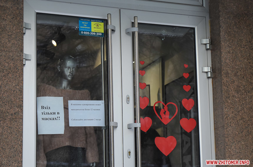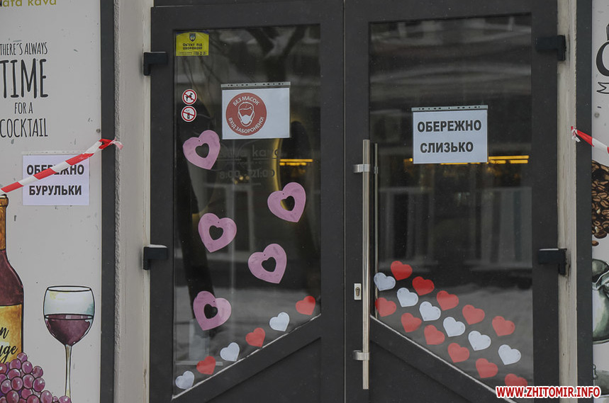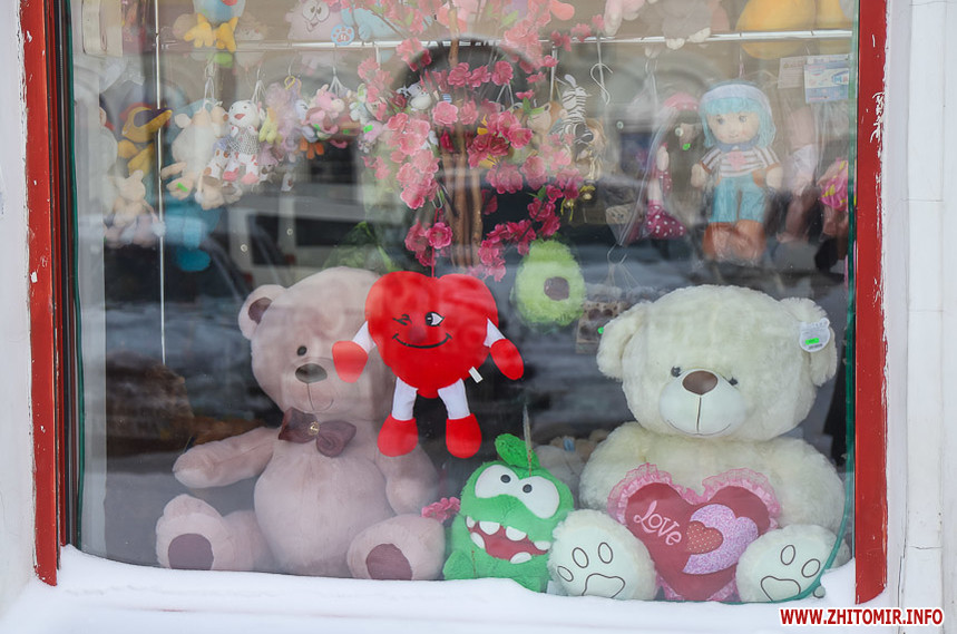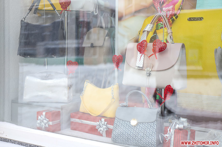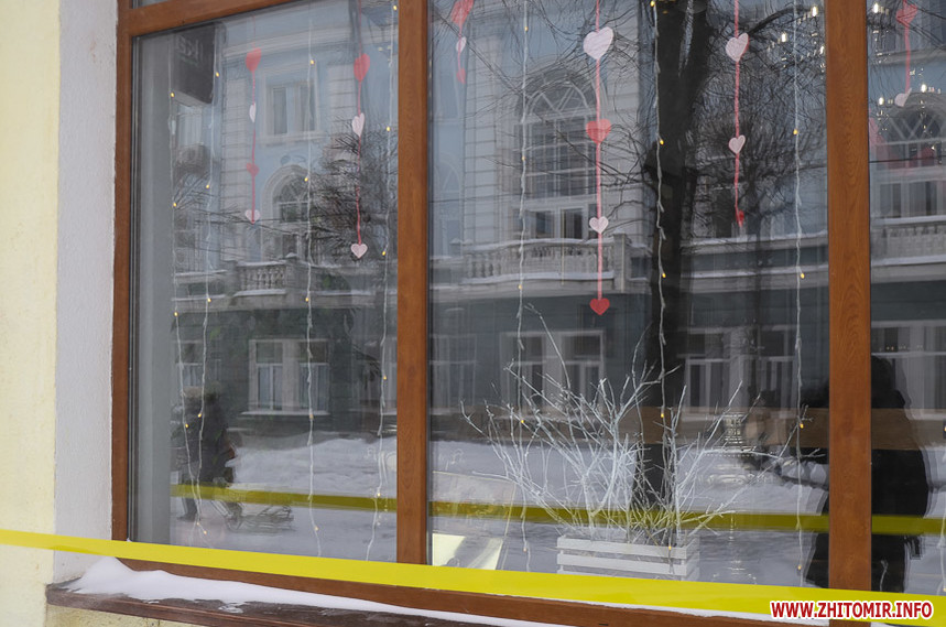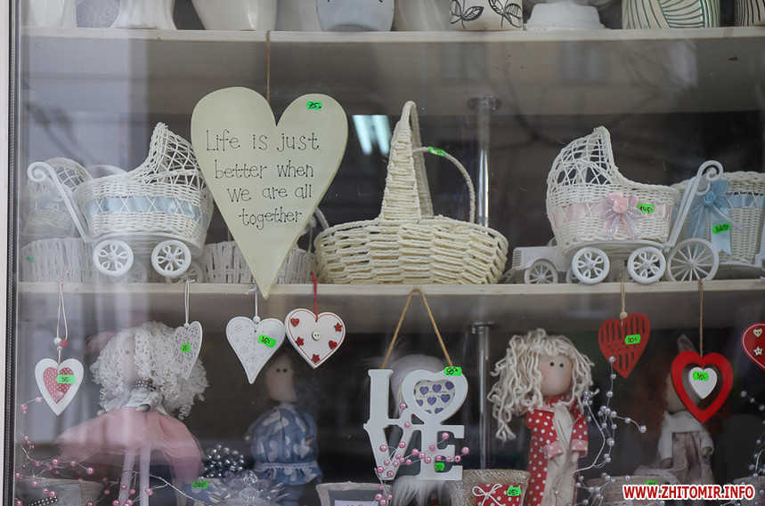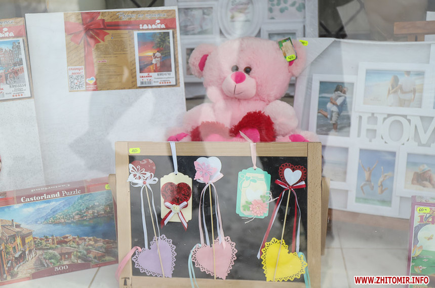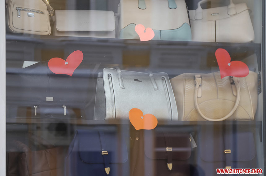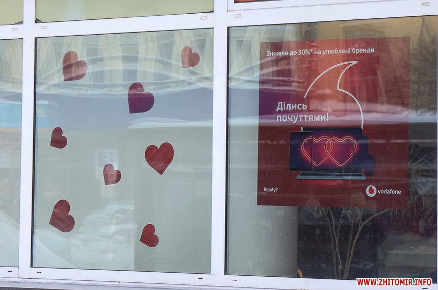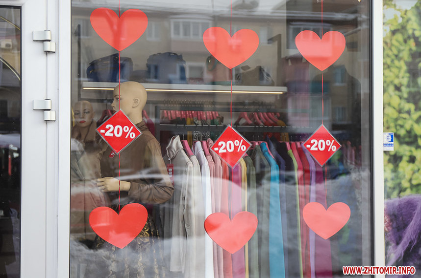 Вже традиційно перед Днем закоханих житомирські заклади та магазини прикрашають свої вітрини у святковій тематиці. У вікнах кафе та магазинів центральних вулицях міста можна побачити безліч сердечок різних форм, розмірів і текстур.