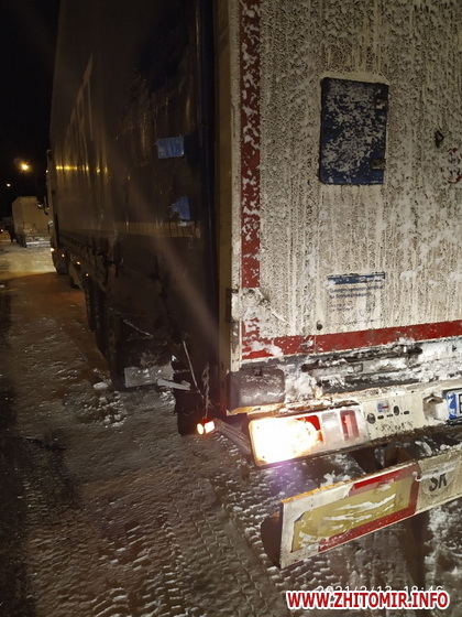 Як повідомляв Житомир.info, 11 лютого 2021 року неподалік смт Довбиш Баранівського району Житомирської області вантажівка Renault в’їхала у Scania, припарковану на узбіччі. В одній фурі рознесло причіп.
