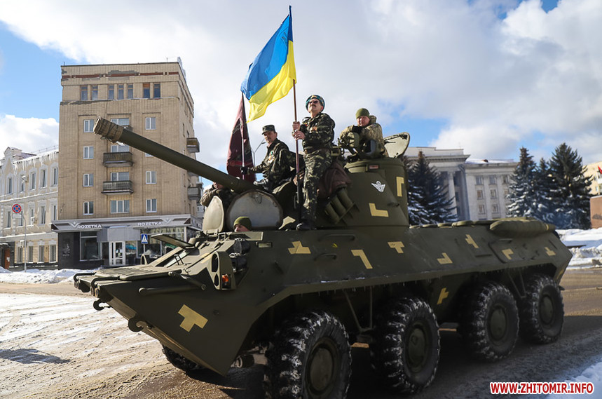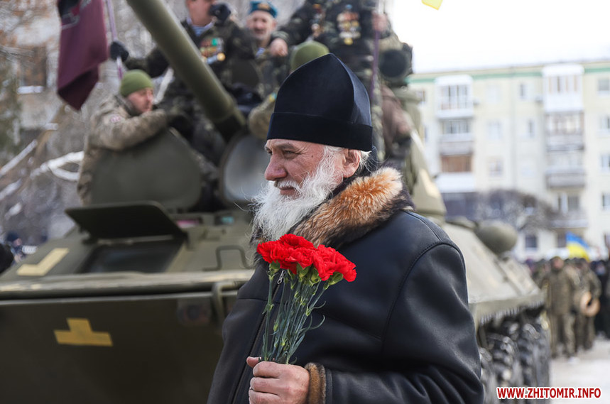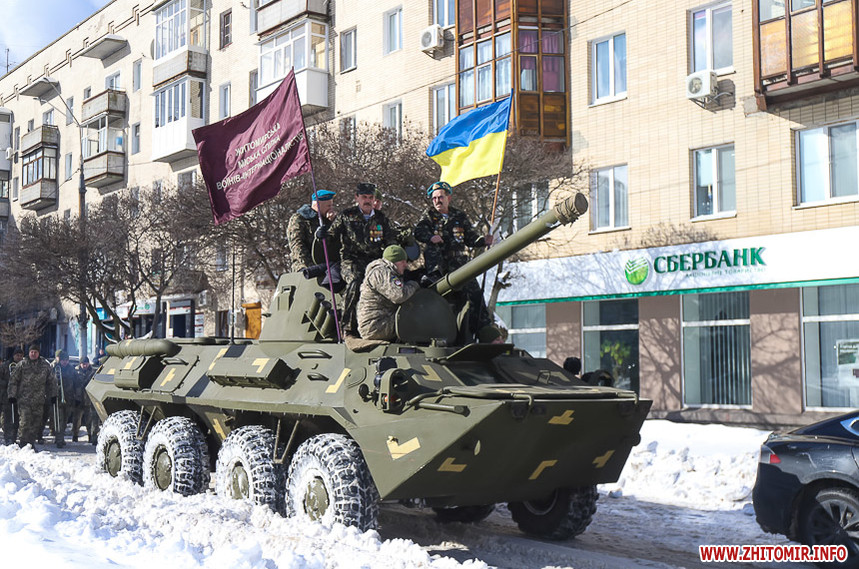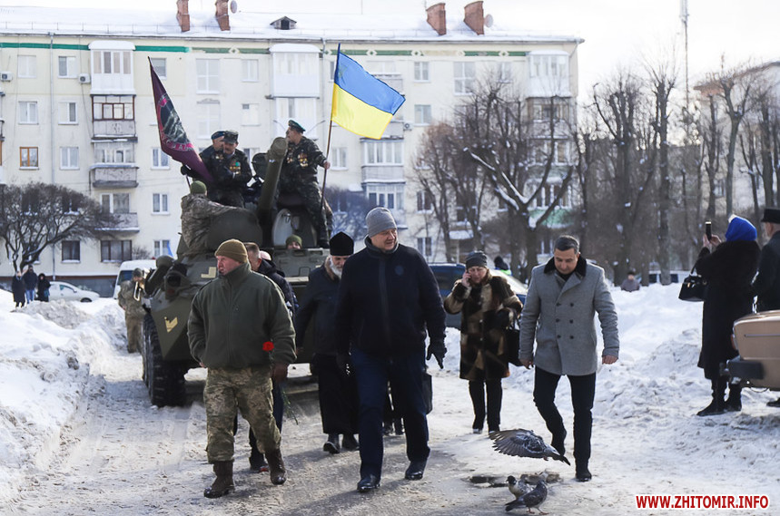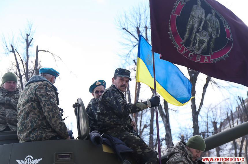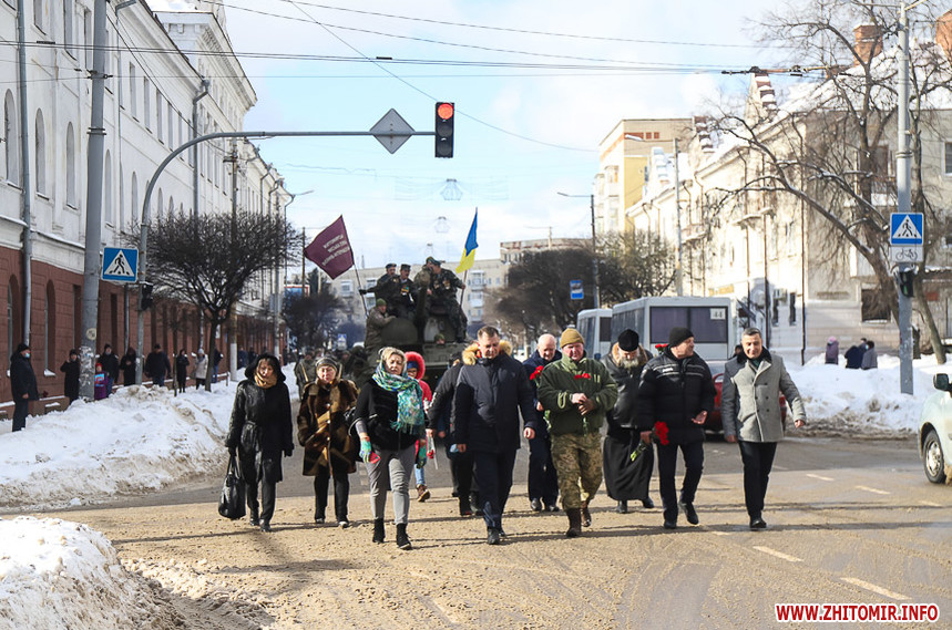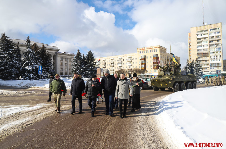 Колона у супроводі оркестру та бронетранспортеру пройшла по вулиці Великій Бердичівській до пам’ятного знаку «Чорний тюльпан», що на Новому бульварі, де відбувся мітинг. Житомиряни, повз яких проходила колона, зупинялися, знімали дійство на телефони та махали руками.