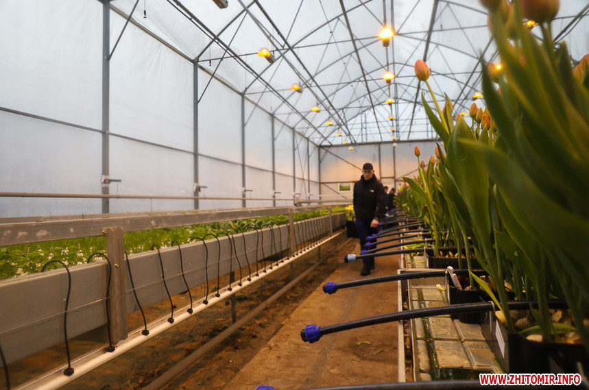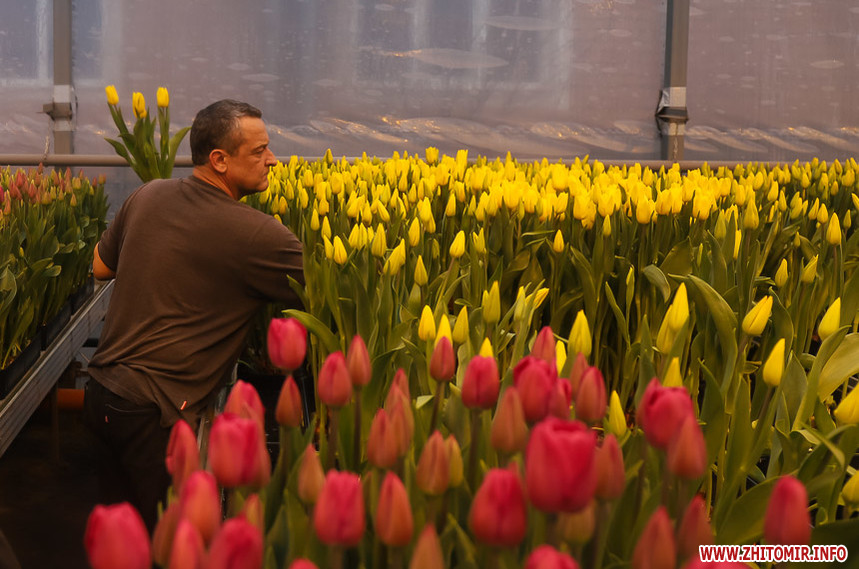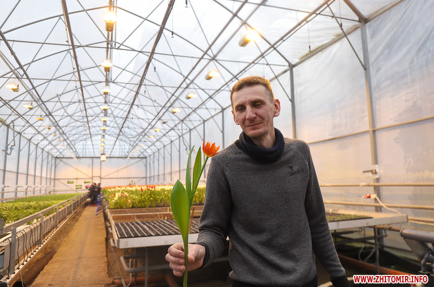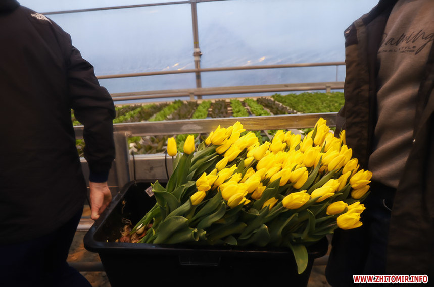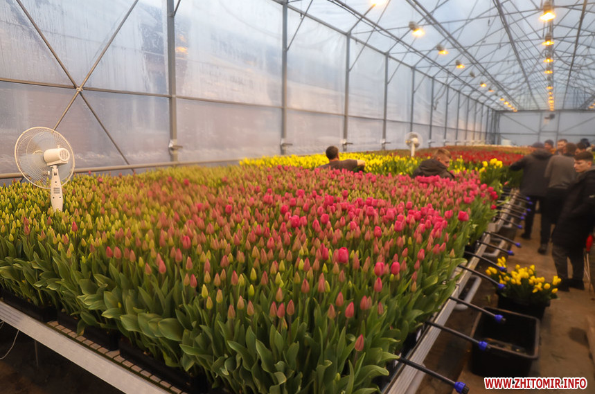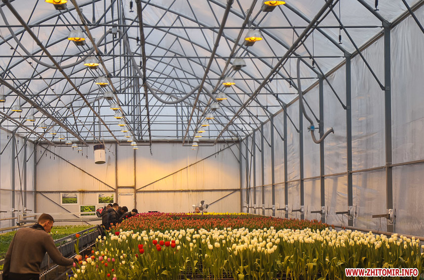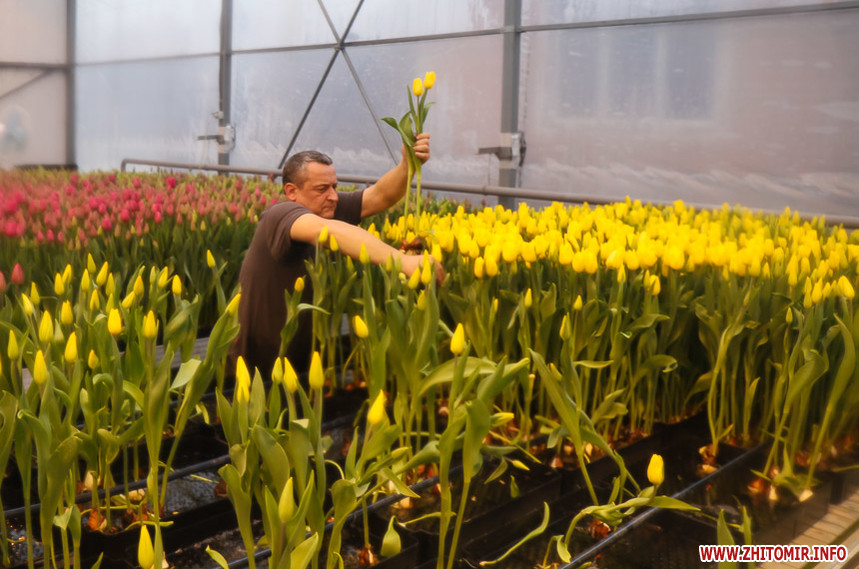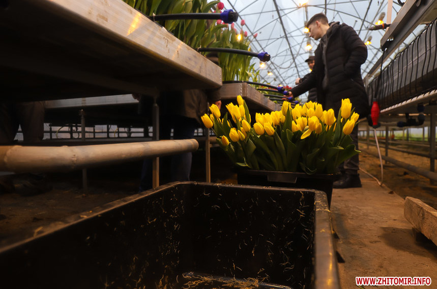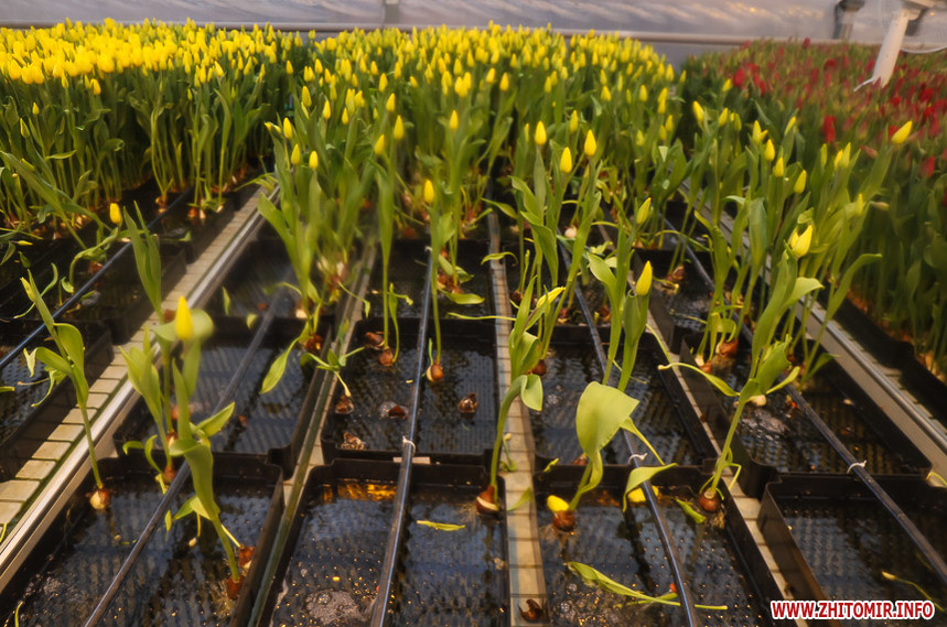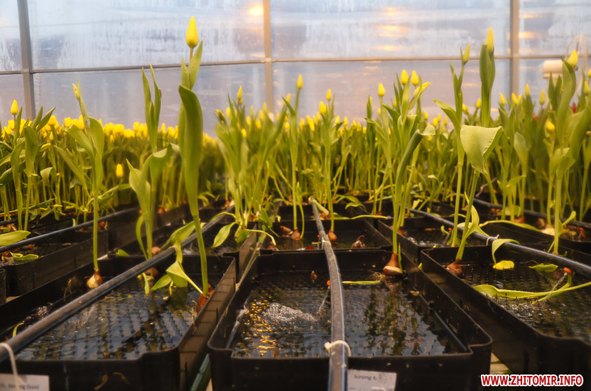“Те, що ви зараз бачите, це вже залишилося трохи більше однієї третьої. Поліський університет робить вигонку безпосередньо для замовника. Весь тюльпан йшов по передзамовленню і поїде на південь України. На Житомир припало з усієї кількості, може, відсотків 10. Вся цибулина голландська сортова 12+. Висота наших тюльпанів виходить не менше 50 сантиметрів. Голландцями тюльпан був запрограмований для цвітіння і зрізу на 4 березня. До 4 березня він має бути повністю весь зібраний безпосередньо з теплиць. Вирощують тюльпани безґрунтовим методом. Така система більш сучасна та провідна: використовується гідропонний метод вирощування. При цьому 100% екологічно безпечне виробництво, тобто у нас вся вода після зрошення іде на злив у дренажний басейн, потім повторно через “міксер” проганяється до рослини. Викиду у зовнішнє середовище у нас немає зовсім. Повністю закритий цикл. Це мінімізує зараження самих рослин. Якщо вирощувати на ґрунті – значно менший вихід продукції, більша трудоємкість самого процесу вирощування і велика ймовірність зараження рослин грибком. У нас рослини за допомогою комп'ютеризованої системи отримують зрошення в той час, коли їм потрібно, необхідну кількість поживних речовин”, – розповів завідувач кафедри машиновикористання і сервісу технологічних систем університету Василь Савченко.