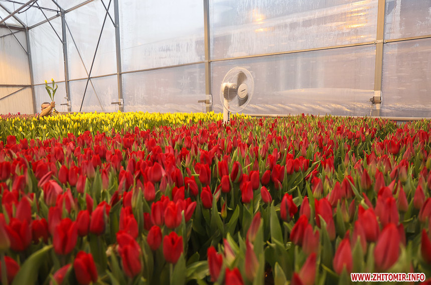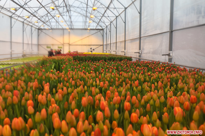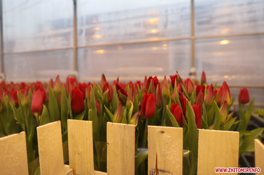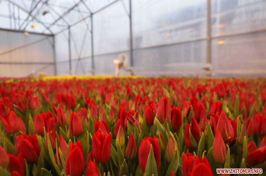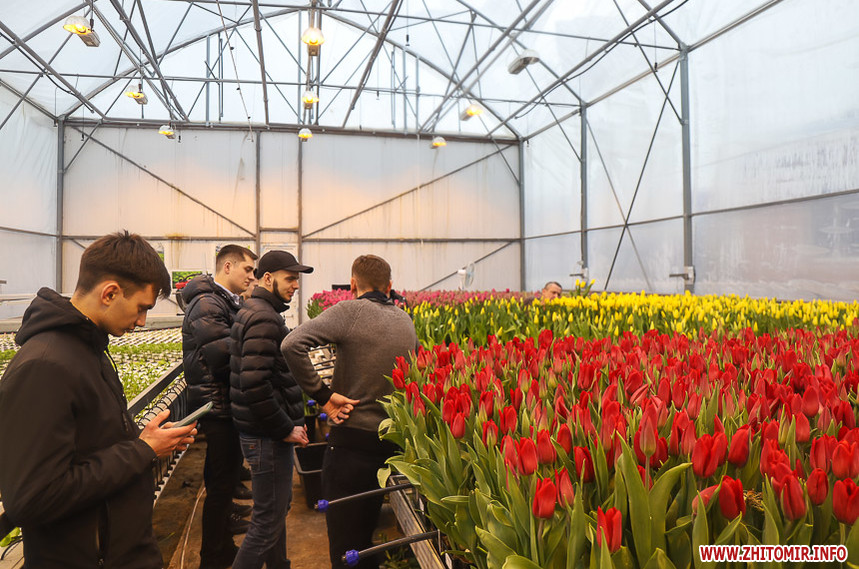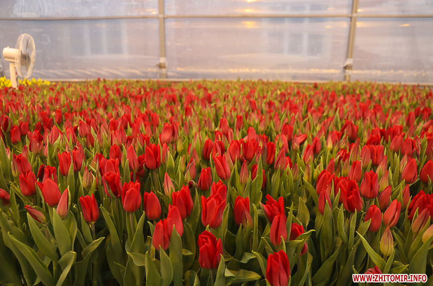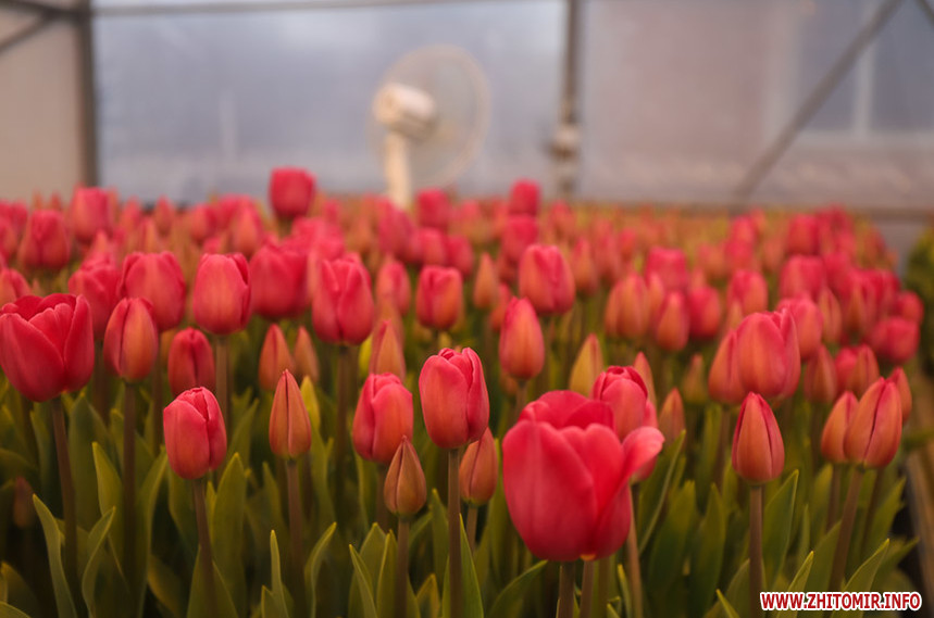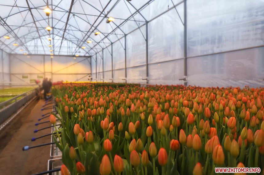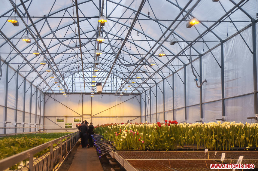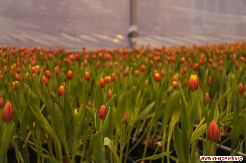 “Те, що ви зараз бачите, це вже залишилося трохи більше однієї третьої. Поліський університет робить вигонку безпосередньо для замовника. Весь тюльпан йшов по передзамовленню і поїде на південь України. На Житомир припало з усієї кількості, може, відсотків 10. Вся цибулина голландська сортова 12+. Висота наших тюльпанів виходить не менше 50 сантиметрів. Голландцями тюльпан був запрограмований для цвітіння і зрізу на 4 березня. До 4 березня він має бути повністю весь зібраний безпосередньо з теплиць. Вирощують тюльпани безґрунтовим методом. Така система більш сучасна та провідна: використовується гідропонний метод вирощування. При цьому 100% екологічно безпечне виробництво, тобто у нас вся вода після зрошення іде на злив у дренажний басейн, потім повторно через “міксер” проганяється до рослини. Викиду у зовнішнє середовище у нас немає зовсім. Повністю закритий цикл. Це мінімізує зараження самих рослин. Якщо вирощувати на ґрунті – значно менший вихід продукції, більша трудоємкість самого процесу вирощування і велика ймовірність зараження рослин грибком. У нас рослини за допомогою комп'ютеризованої системи отримують зрошення в той час, коли їм потрібно, необхідну кількість поживних речовин”, – розповів завідувач кафедри машиновикористання і сервісу технологічних систем університету Василь Савченко.