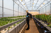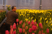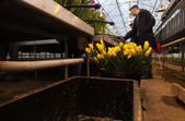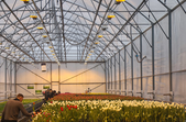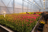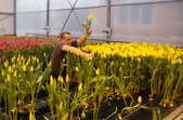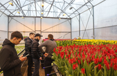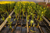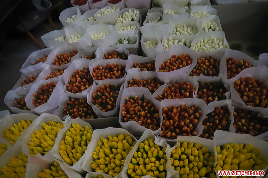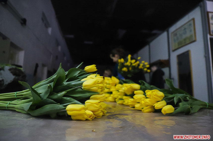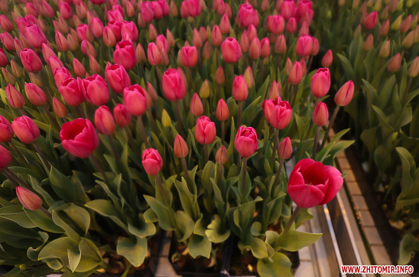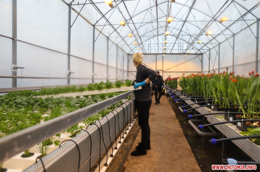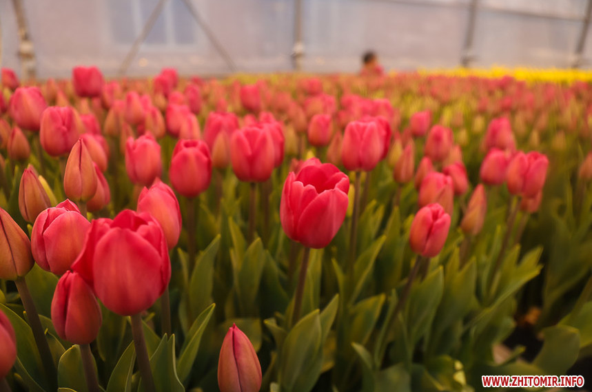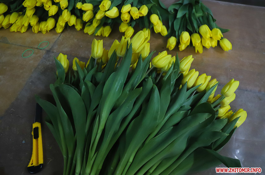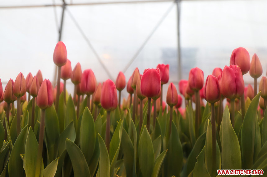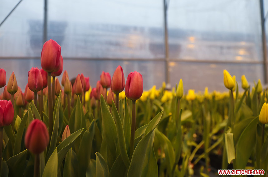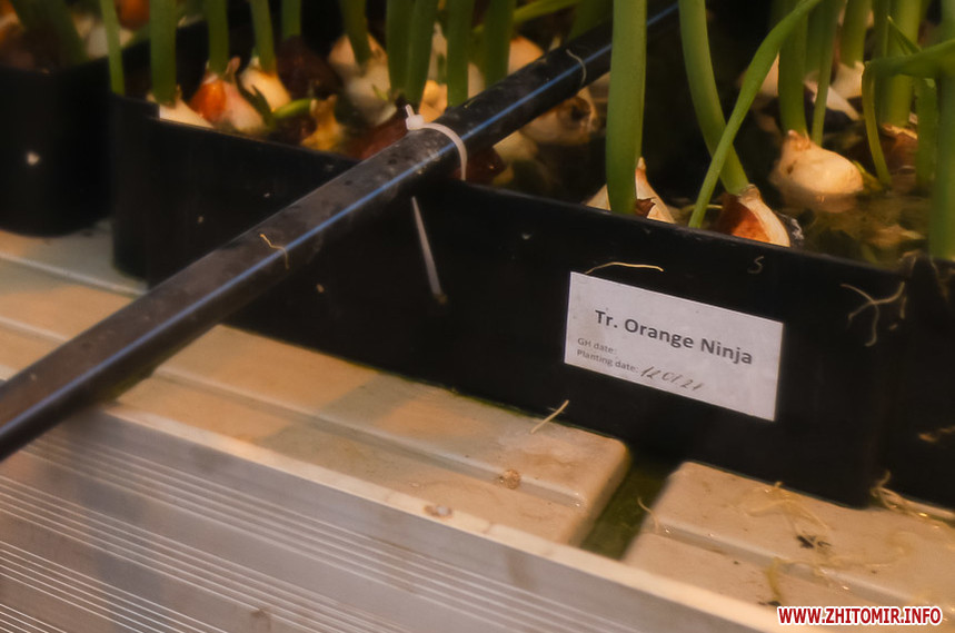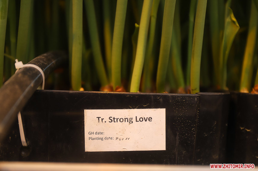 “Те, що ви зараз бачите, це вже залишилося трохи більше однієї третьої. Поліський університет робить вигонку безпосередньо для замовника. Весь тюльпан йшов по передзамовленню і поїде на південь України. На Житомир припало з усієї кількості, може, відсотків 10. Вся цибулина голландська сортова 12+. Висота наших тюльпанів виходить не менше 50 сантиметрів. Голландцями тюльпан був запрограмований для цвітіння і зрізу на 4 березня. До 4 березня він має бути повністю весь зібраний безпосередньо з теплиць. Вирощують тюльпани безґрунтовим методом. Така система більш сучасна та провідна: використовується гідропонний метод вирощування. При цьому 100% екологічно безпечне виробництво, тобто у нас вся вода після зрошення іде на злив у дренажний басейн, потім повторно через “міксер” проганяється до рослини. Викиду у зовнішнє середовище у нас немає зовсім. Повністю закритий цикл. Це мінімізує зараження самих рослин. Якщо вирощувати на ґрунті – значно менший вихід продукції, більша трудоємкість самого процесу вирощування і велика ймовірність зараження рослин грибком. У нас рослини за допомогою комп'ютеризованої системи отримують зрошення в той час, коли їм потрібно, необхідну кількість поживних речовин”, – розповів завідувач кафедри машиновикористання і сервісу технологічних систем університету Василь Савченко.
